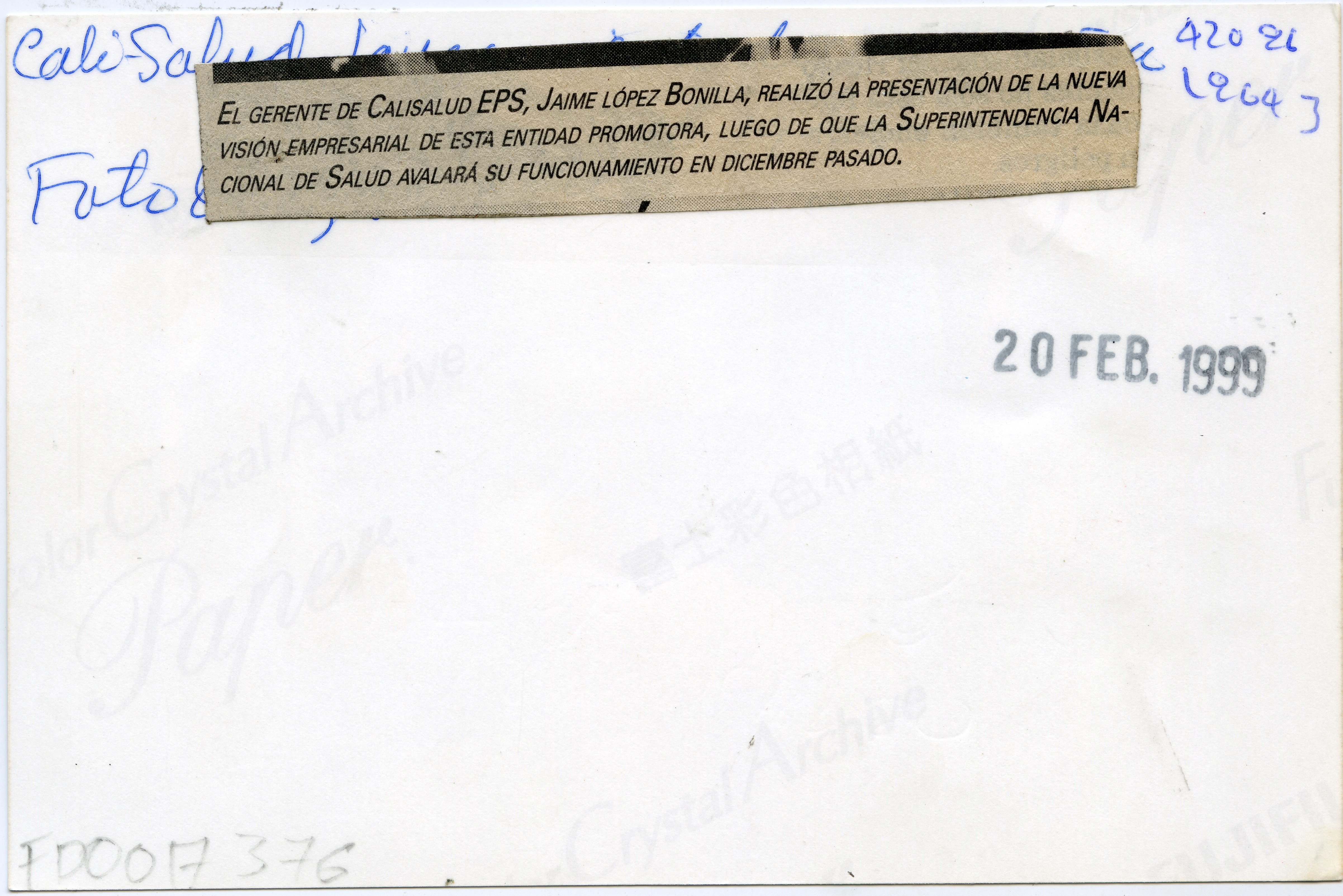Ricardo Cobo, alcalde de Cali, en reunión con el gerente de Cali Salud EPS, Jaime López Bonilla. Al reverso de la fotografía se anexa recorte: El gerente de Cali Salud EPS, Jaime López Bonilla, realizó la presentación de la nueva visión empresarial de esta promotora, luego de que la Superintendencia Nacional de Salud avalará su funcionamiento en diciembre pasado
