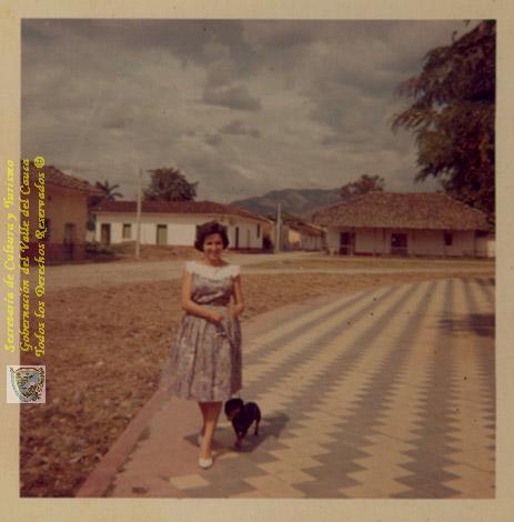 La señora Ana L. García pasenado con su mascota por el parque. Al fondo a la derecha la casona donde hoy funciona la alcaldía, a la izquierda la casa donde funciona hoy día teletuluá. San Pedro, 1980.