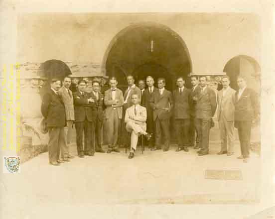 Inauguración oficial del acueducto metálico a presión. Adelante Jorge Zawadzky Colmenares, presidente del Consejo municipal; de pies de izquierda a derecha.: Julio Córdoba, Mateo Gamboa Young, Apolinar Ramírez, Gustavo Sinisterra Riascos, George C. Bunker, Luis Domínguez Sánchez, Francisco A. Palacios, Carlos Borrero Sinisterra, Isaías Mercado Quintero, Luis Angel Tofiño, Francisco Llanos, Francisco Daza, Marco Antonio Guerrero Espinosa y Capitolino Sánchez. Cali. 1930.