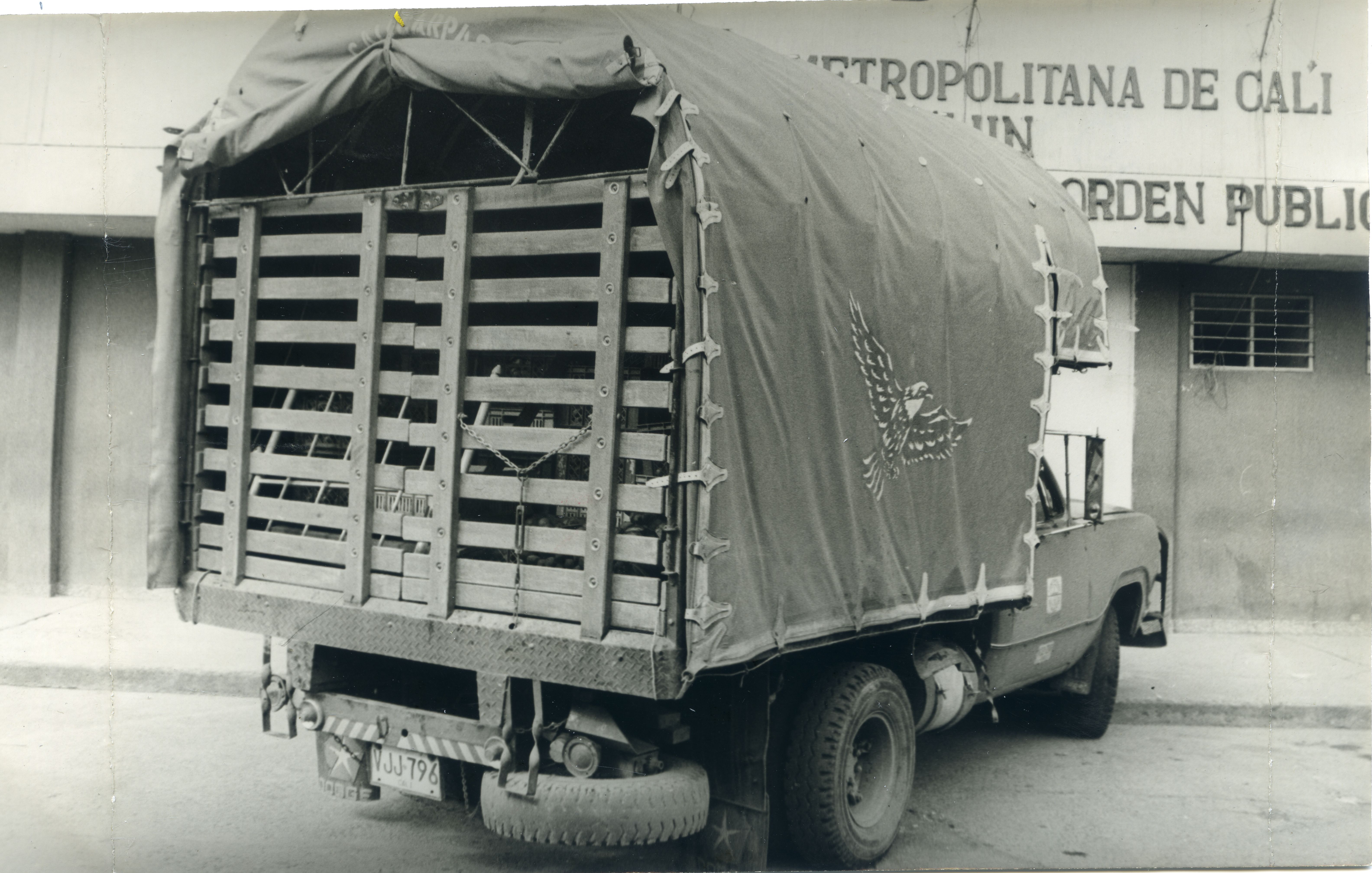 En la fotografía podemos observar un pequeño camión de carga de placas VJJ 796 estacionado a las afueras de una estación de policía de la ciudad de Cali.