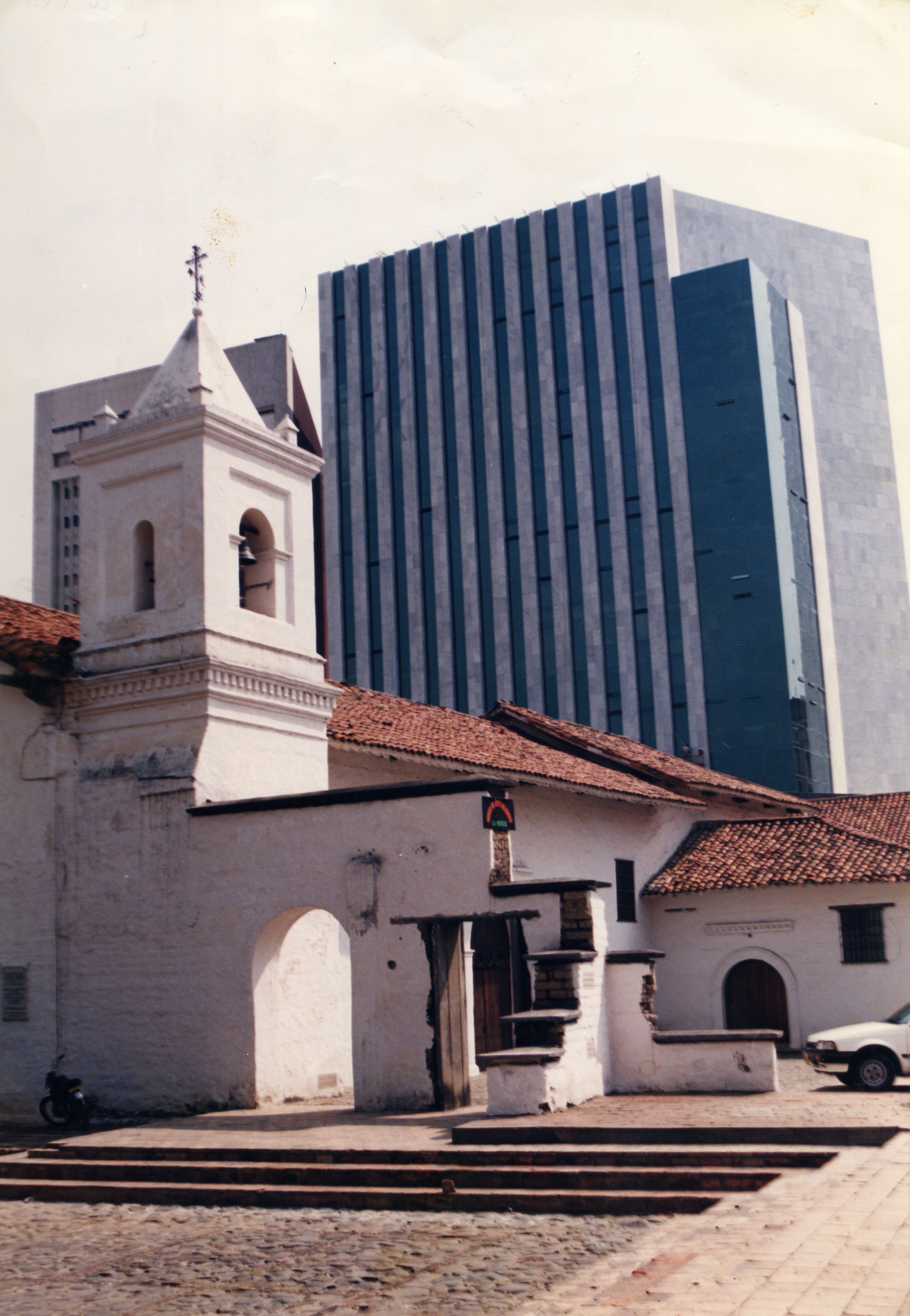 La iglesia La Merced antigua y el edificio Banco de Occidente, contrasta por ser una edificación moderna