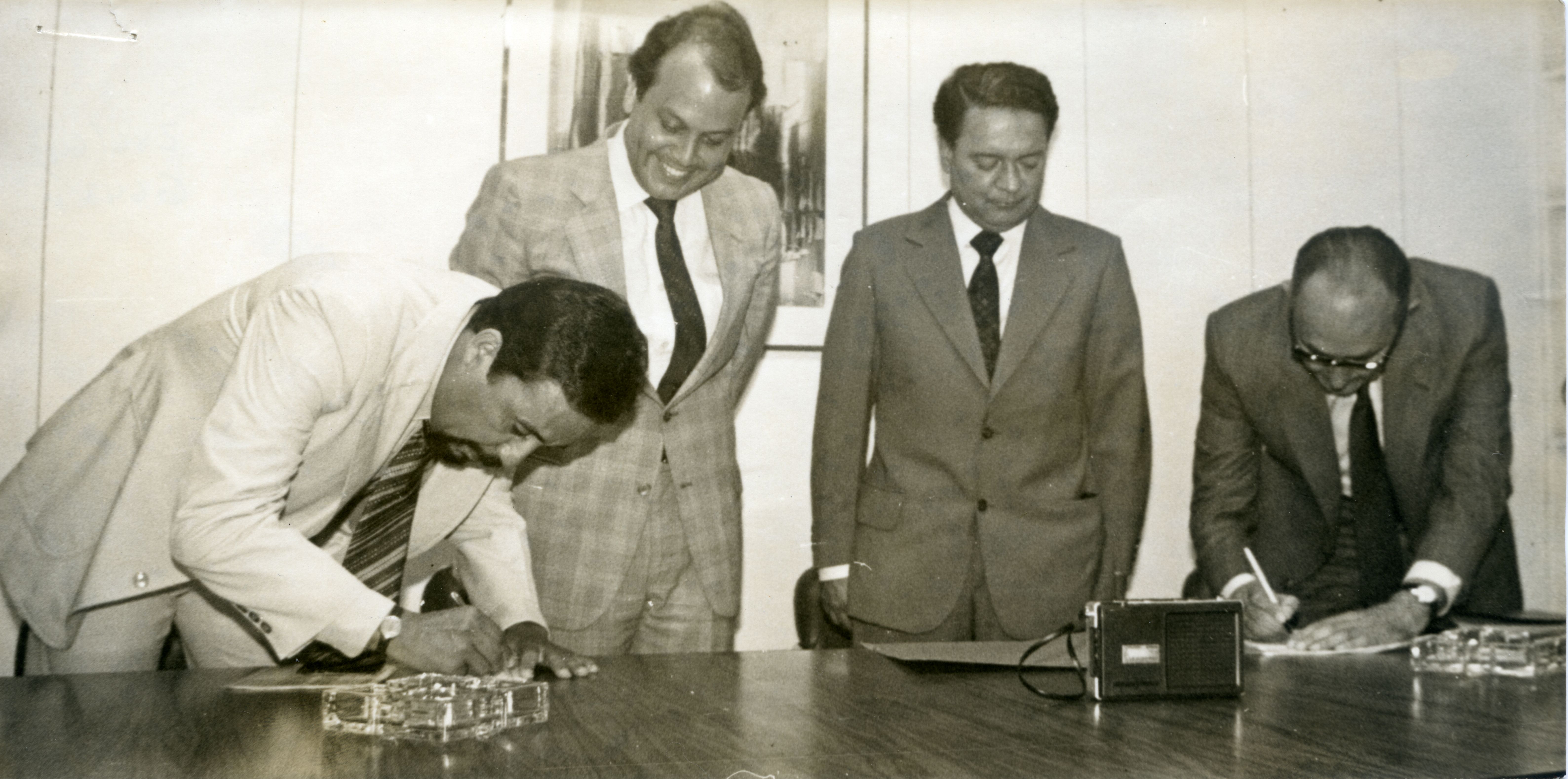 Humberto González Narváez, gobernador del Valle, en compañía de tres personas. Se aprecia firma de documentos