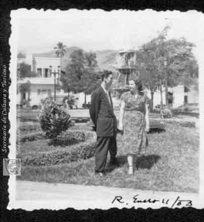 Carlos Julio Villafañe Ordoñez y una amiga en el Parque principal. Roldanillo,1953.