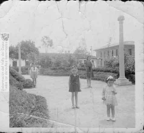Jairo Arias, Estella Arias y Dolly Arias de paseo por el parque Uribe Uribe de Sevilla. 1940