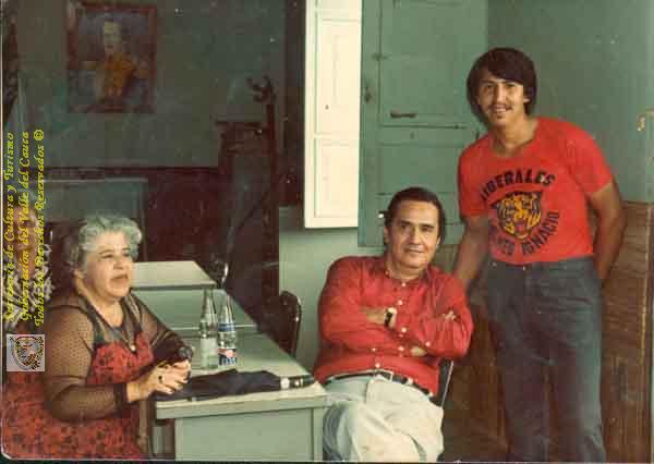 Carlos Holmes Trujillo, caudillo liberal, acompañado de Edilberto Arias, Olga Agudelo y Mariela de García. Alcalá, Casa de Gobierno, C. 1979.