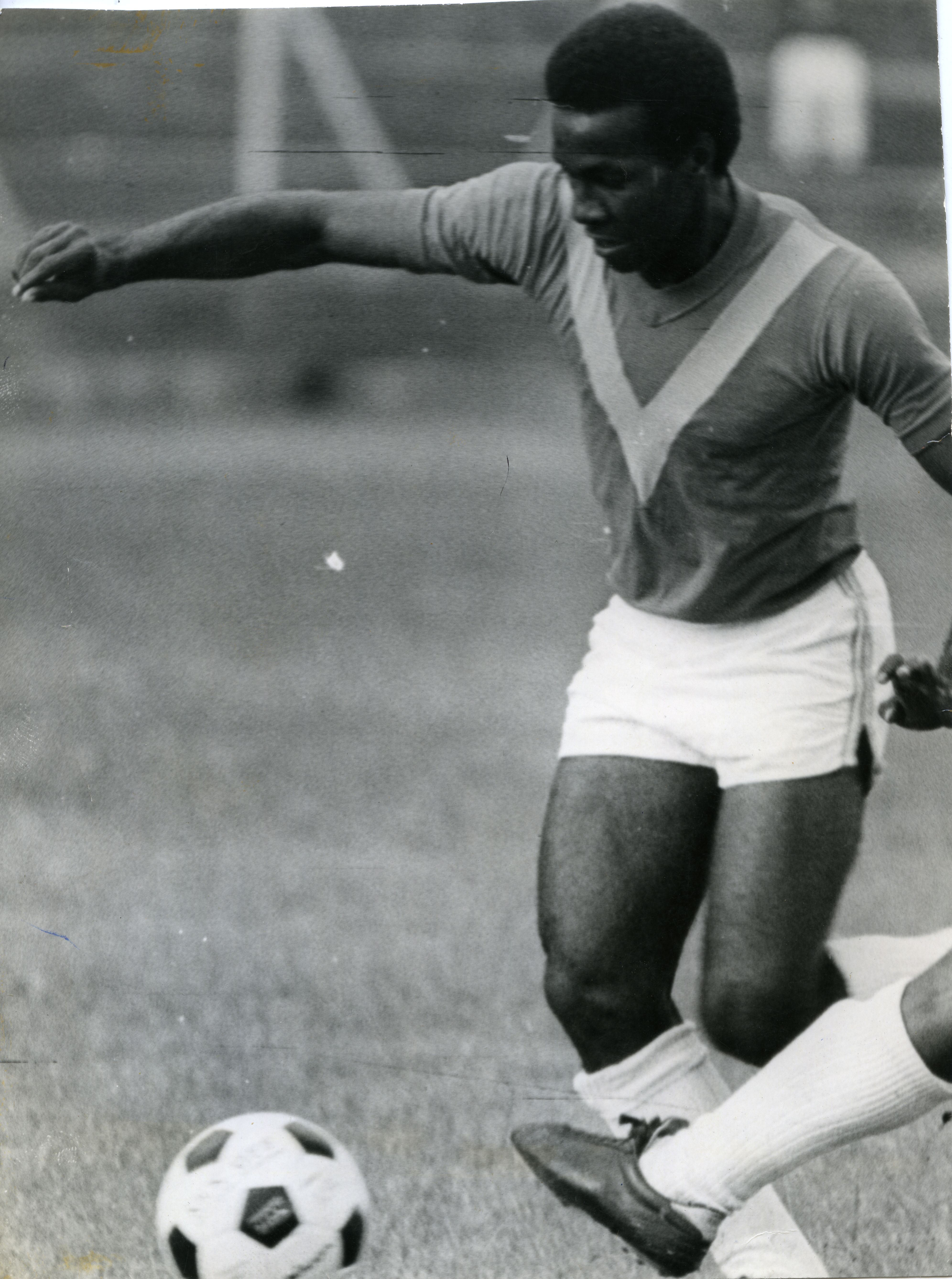Luis Alfonso Tovar Lasso, Buga, Valle del Cauca, jugador de Fútbol. Se aprecia disputando el balón. Se observa con el uniforme del Quindio. Tovar Lasso fue goleador en el año 1974