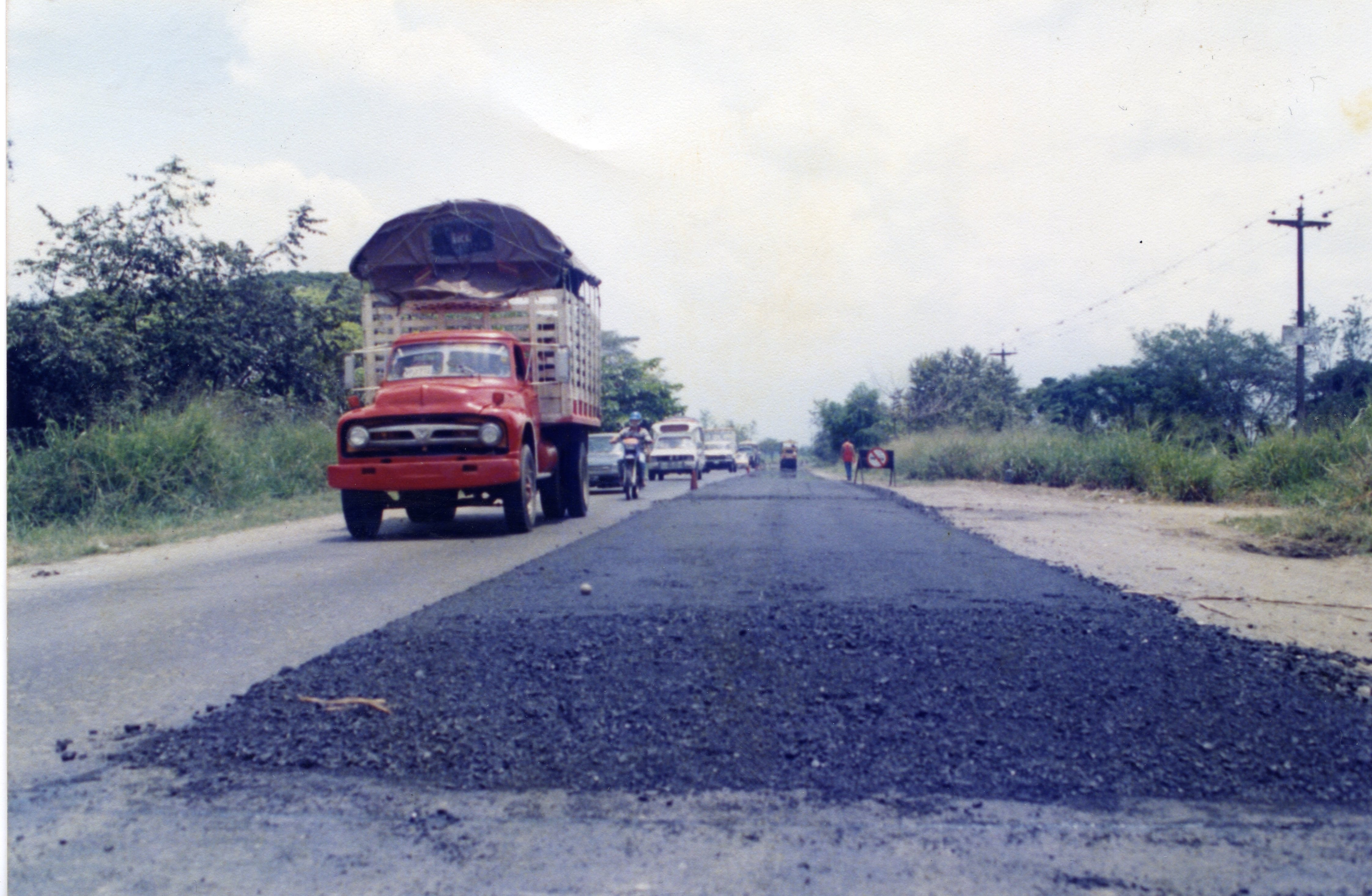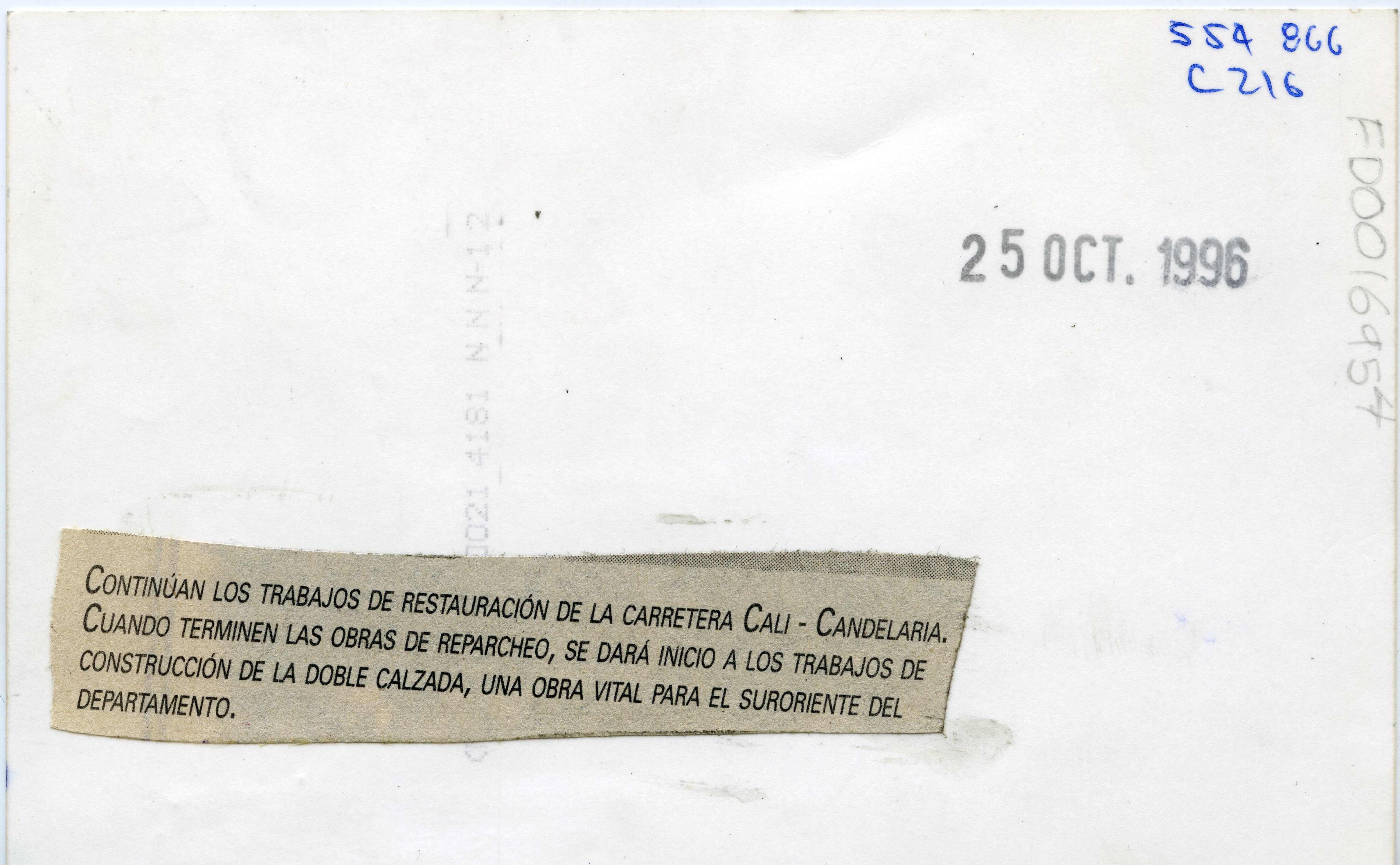 Al reverso de la fotografía se anexa recorte de prensa: "Continúan los trabajos de restauración de la carretera Cali-Candelaria. Cuando terminen las obras de reparcheo, se dará inicio a los trabajos de construcción de la doble calzada, una obra vital para el suroriente del departamento."
