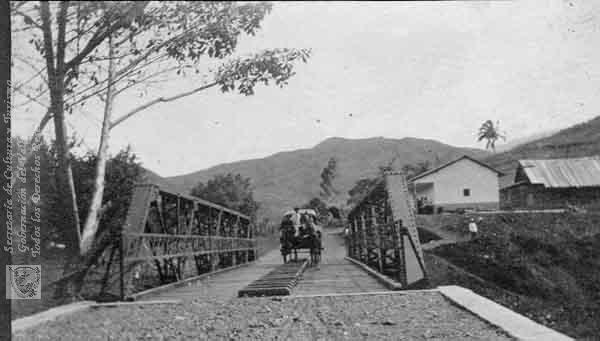 Coche cruzando el puente sobre el río Aguacatal. Santiago de Cali, 1921.