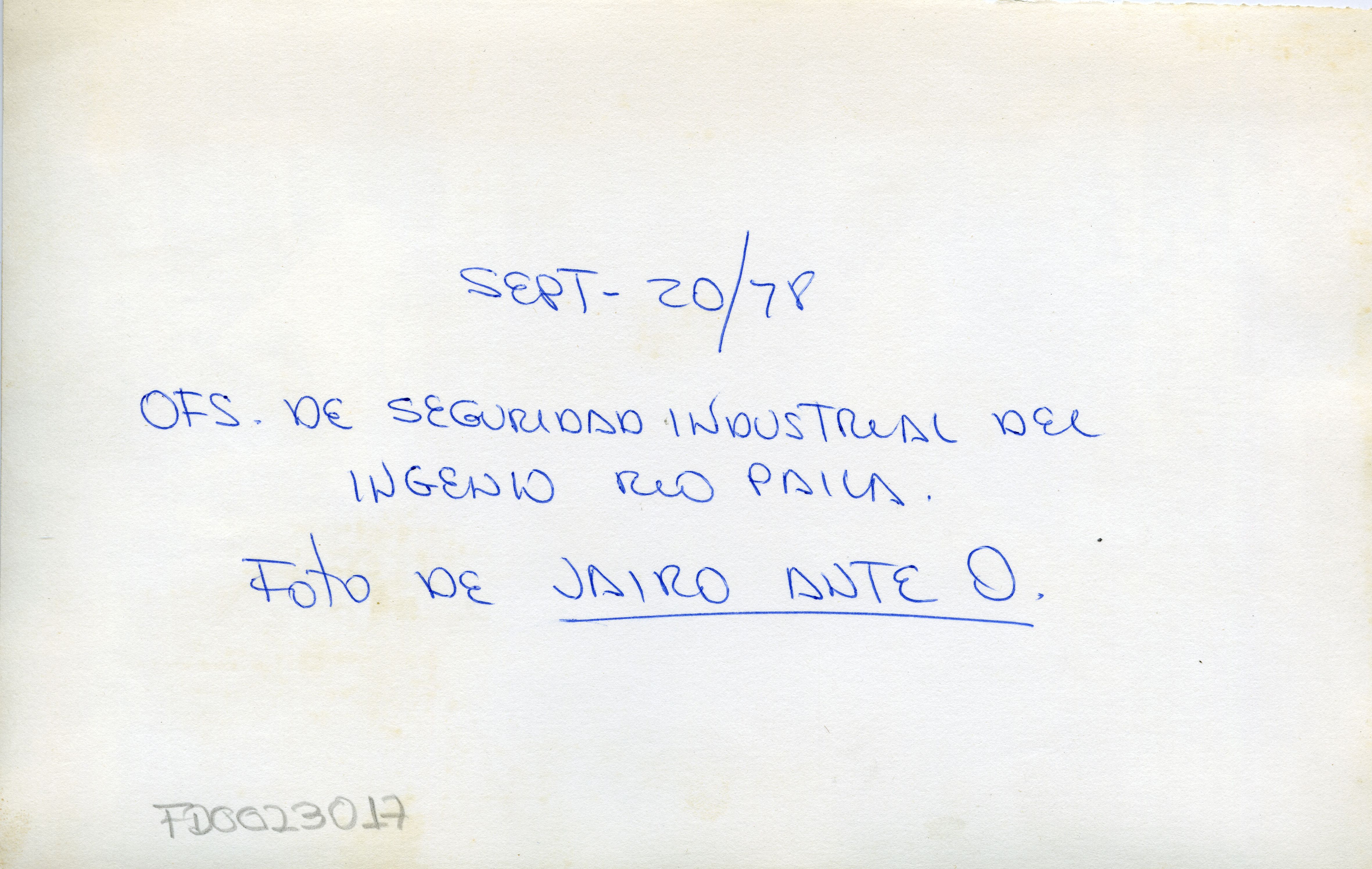 El Ingenio Riopaila S.A. fue fundado por Don Hernando Caicedo el 24 de Septiembre de 1928, cuando adquirió la Hacienda La Paila de 415 fanegadas, terrenos adecuados para el cultivo de la caña de azúcar, donde se estableció un pequeño trapiche panelero que con el tiempo se transformó en una fábrica azucarera. Se aprecia interior oficinas de seguridad industrial del ingenio Riopaila. Observamos tres hombres y varios afiches de seguridad industrial
