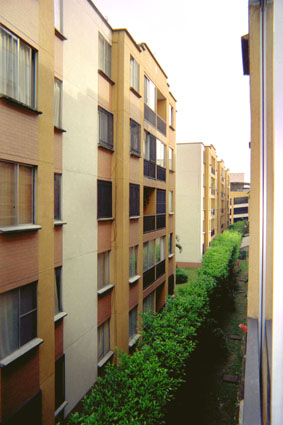 Plano medio. En la imagen se puede apreciar la fachada lateral de algunos edificios pintados de color blanco y amarillo. En el centro de la imagen un corredor con algunos arbustos.