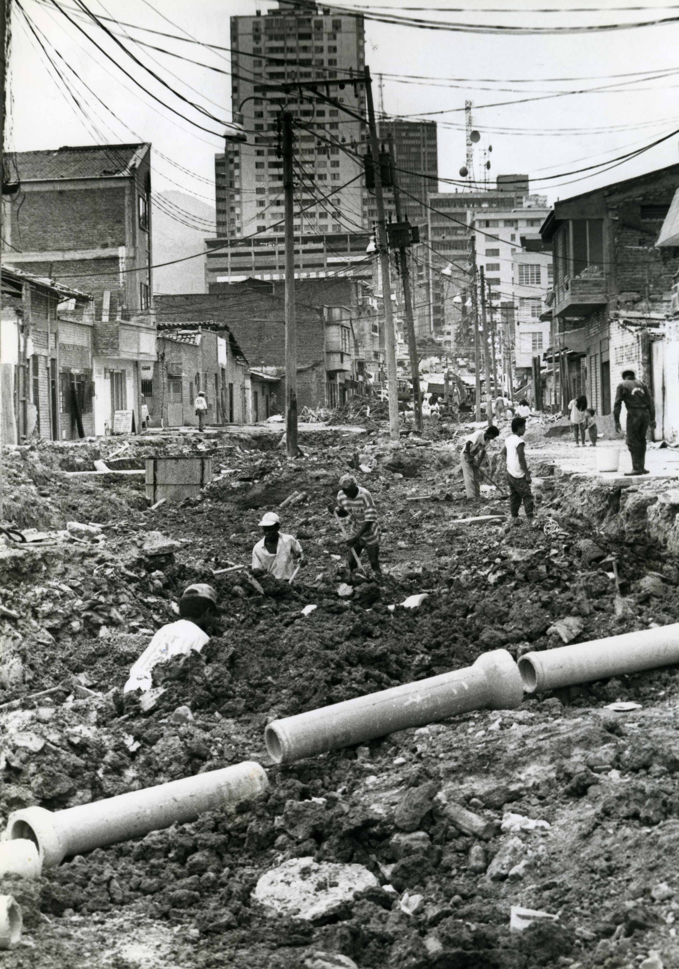 En el pie de foto dice lo siguiente: Más vías para Cali. Trabajos de reconstrucción del canal de alcantarillado, además de la ampliación y pavimentación de la vía, efectúa la administración municipal de Cali en las calles novena y diez. El proyecto, que re realiza con dineros de la sobretasa a la goasolina y cobro de Valorización tiene un costo superior a los dos mil millones de pesos y permitirá el desahogo del centro de la ciudad, tanto de ingreso como de salida de esta zona.- El Archivo del Patrimonio Fotográfico y Fílmico del Valle del Cauca es responsabilidad de la Biblioteca Departamental del Valle Jorge Garcés Borrero, por convenio de cooperación suscrito con la Secretaria del Cultura Departamental, con el fin de aunar esfuerzos para su conservación, preservación y divulgación del Archivo entre la comunidad Vallecaucana, especialmente entre los estudiantes e investigadores que visitan la Biblioteca, propiciando el su uso y consulta permanente. La universidad Icesi es un colaborador en el proceso de difusión, facilitando la tecnología que permite la consulta de las imágenes.