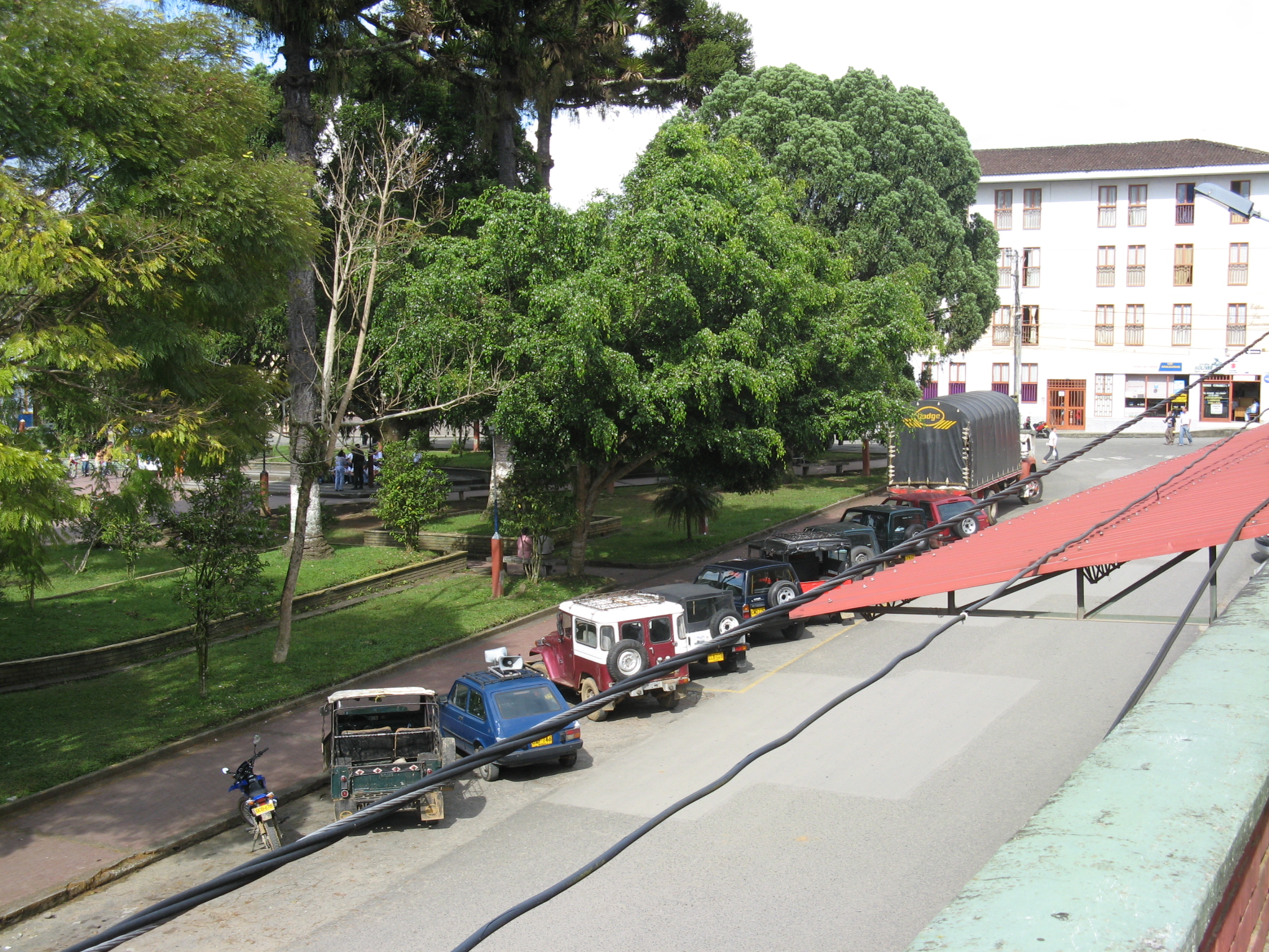 Sevilla, Valle del Cauca. Fundado en 1903, por Eraclio Uribe y Colonos antioqueños y caldenses. Nombres: San Luis. Municipio desde 1914. Economía importante en agricultura, caficultura, ganadería, comercio, minería, entre otros. Atractivo turístico: Basílica San Luis Gonzaga, Café Casablanca, fincas cafeteras. Observamos en la imagen, el parque público, carros, edificio y las calles