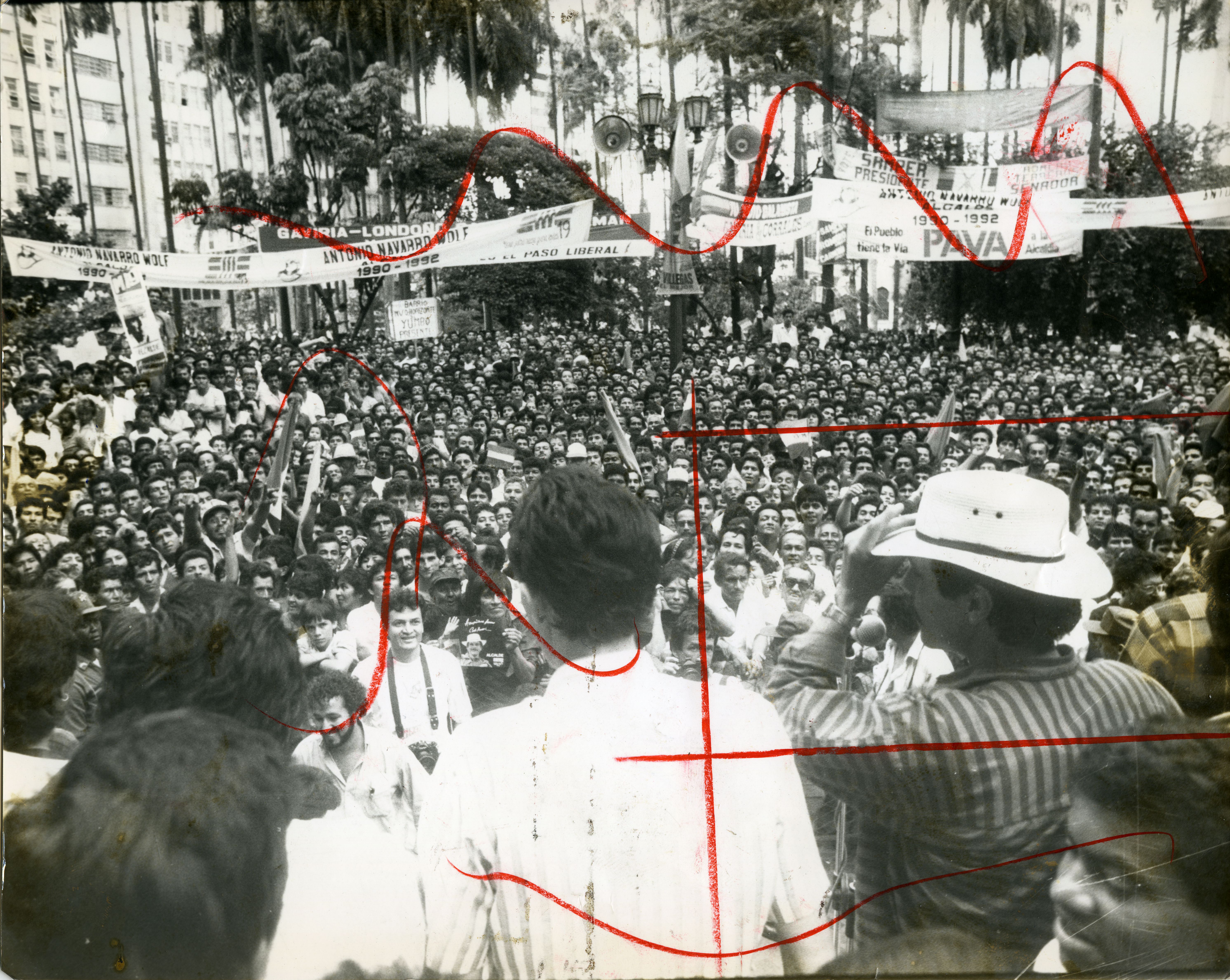 En la gráfica se observa al ex comandante máximo del M-19, Carlos Pizarro, hablando frente a un público numeroso en el Parque Caicedo.