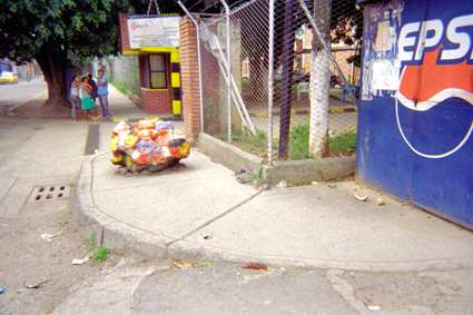 Caicedo Castillo, J. (2005). Esquina en la que se destaca el lateral de una caseta con publicidad, junto a ella un cerramiento en malla y sobre un andén una roca pintada con colores variados. Santiago de Cali: Biblioteca Departamental Jorge Garces Borrero.