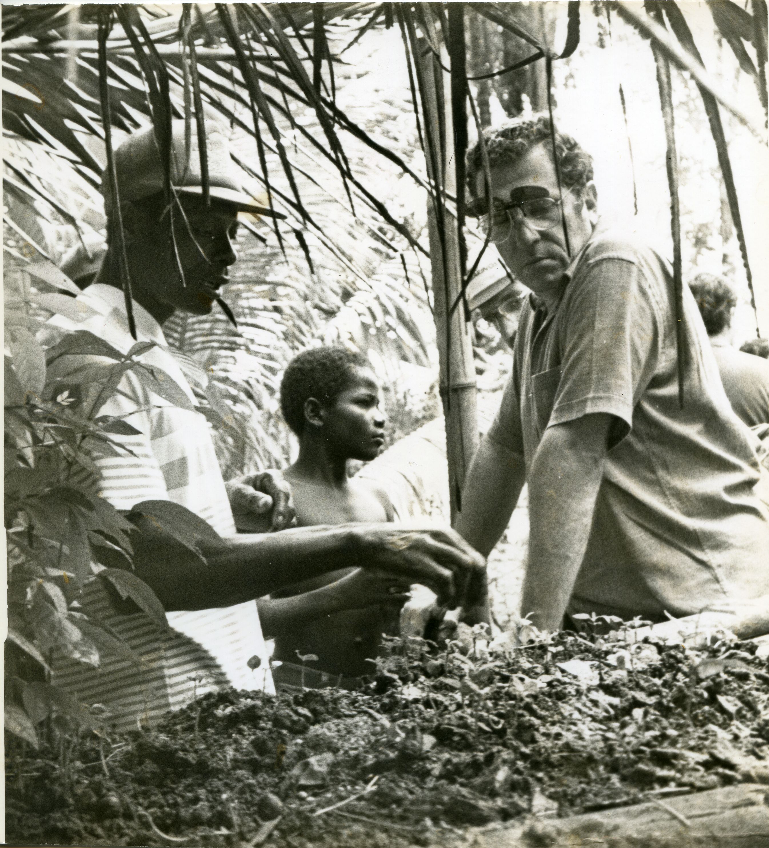 Fotografia de plano medio largo del gobernador Carlos Holguin Sardi, donde se observa con anteojos con las manos apoyadas en la tierra, al lado de él se ve a un niño y otra persona más