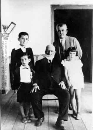 El señor Heraclio Uribe Uribe fundador de Sevilla, junto a éste, el señor Tomás Arana y sus hijos Solange,y Demetrio, y otro niño por identificar
