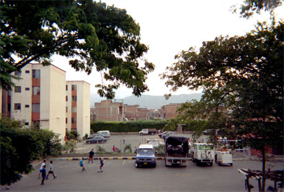 Plano general. Exterior día. Conjunto de edificios en lateral izquierdo. Sujetos jugando en franja inferior, junto a carros. Árboles sirven de marco.