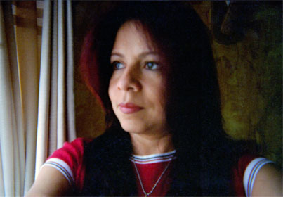 Primer plano.Mujer con fondo difuso en lateral derecho. Realce de pliegues de cortina con filtración de luz en lateral izquierdo.