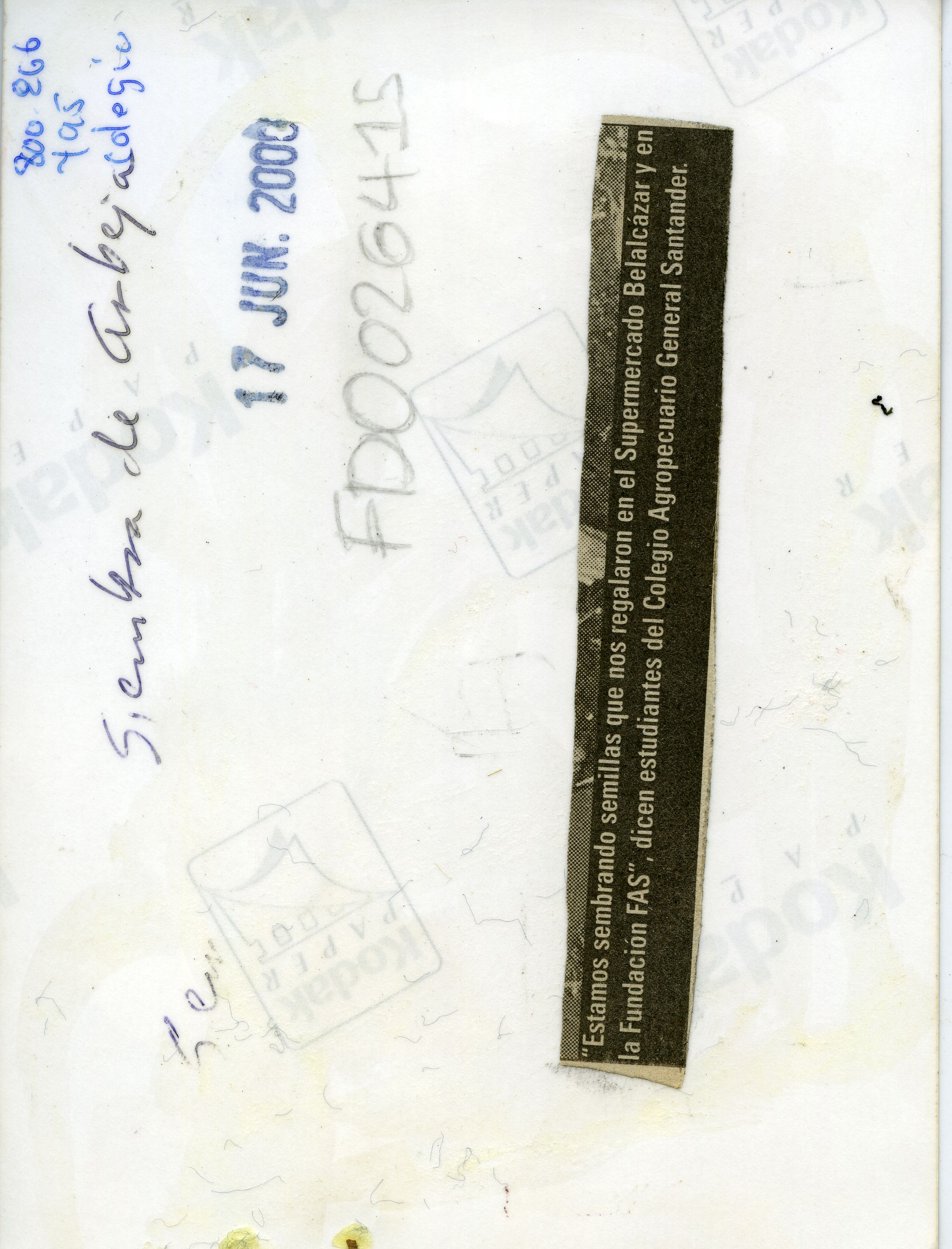 Al reverso de la fotografía se anexa recorte: Estamos sembrando semillas que nos regalaron en el supermercado Belalcázar y en la fundación FAS", dicen estudiantes del colegio Agropecuario General Santander.
