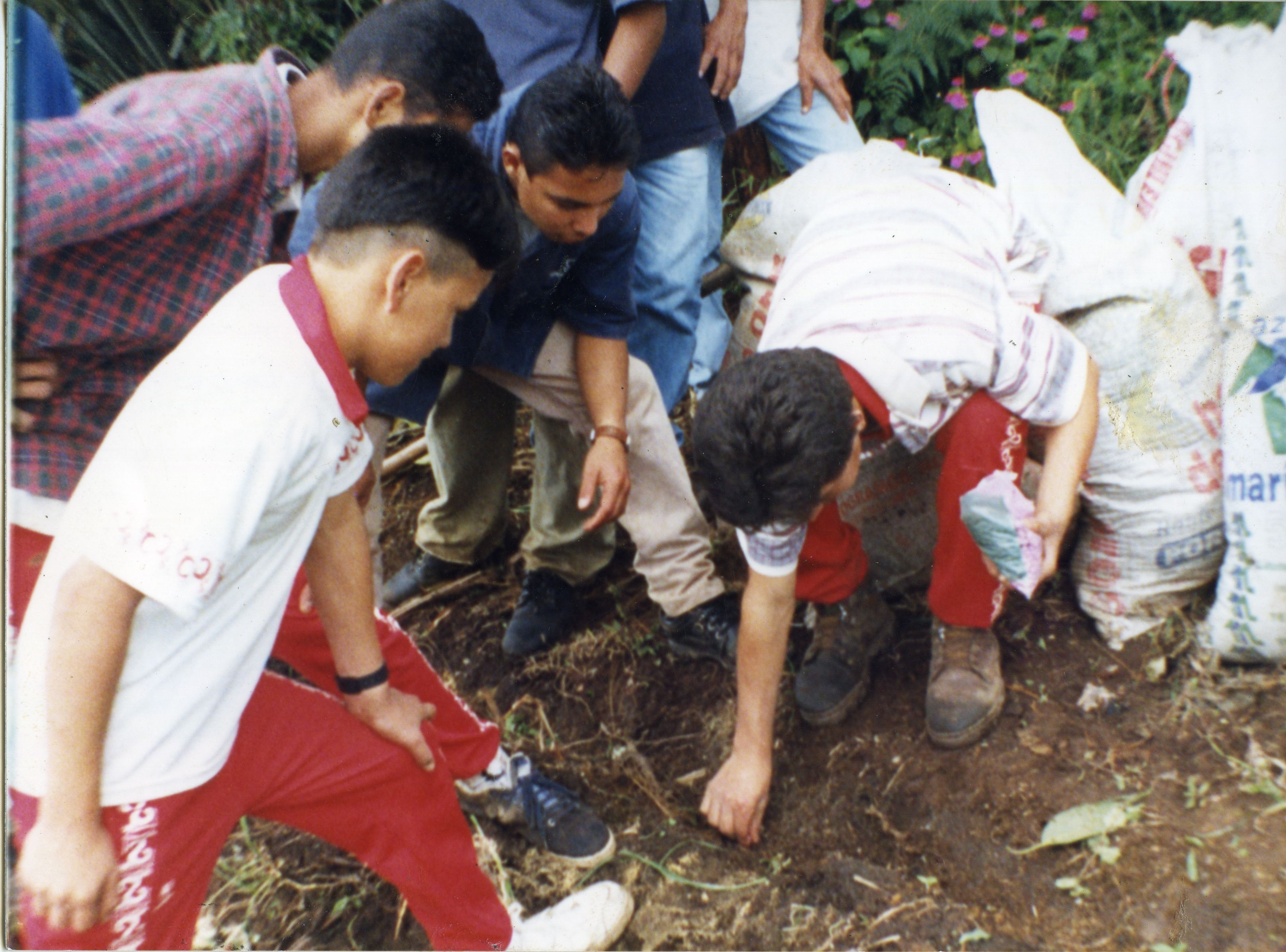 Foto de primer plano largo donde podemos ver a un grupo de adolescentes alrededor de una zanja o hueco, también observamos a un joven con una bolsa pequeña en su mano izquierda, mientras que la otra mano esta dentro del hueco, al costado izquierdo se ven unos costales