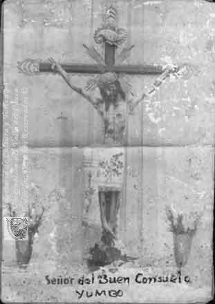 Imágen del Señor del Buen Consuelo, escultura perteneciente a la escuela quiteña y venerada en Yumbo desde finales del siglo XVII.Aparece en la parroquia a partir del 10 de julio de 1720. Yumbo. C. 1930.