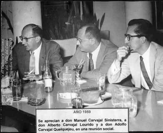 s. n. & s. n. (1959). Manuel Carvajal Sinisterra, Alberto José Carvajal Lourido y Adolfo Carvajal Quelquejeu, en una reunión social & 402578. SANTIAGO DE CALI: Biblioteca Departamental Jorge Garces Borrero.