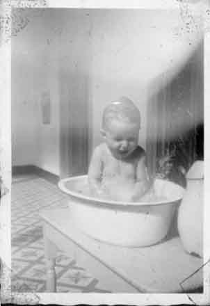 El niño Gustavo Alvarez Gardeazábal cuando tenía 6 meses de edad, disfrutando del baño en un platón. Tuluá, C.1946.