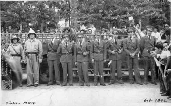 Cuerpo de Bomberos de Palmira, entre los oficiales se encuentran el Sargento Damián Terreros y Luis Fischer pertenecientes al Cuerpo de Bomberos de Cali. Palmira. C. 1942.
