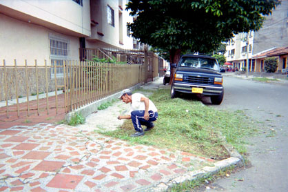 Perfil de hombre, que poda césped en enfoque central. Exterior día. Toma frontal de carro. Acera con presencia de grieta.