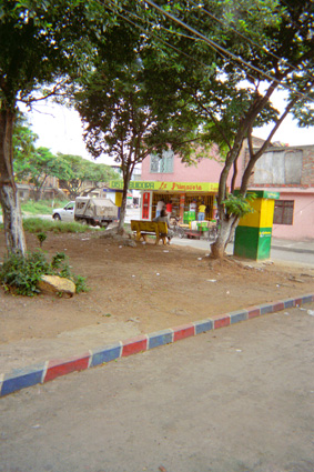 Plano medio. En la imagen se puede apreciar en el extremo inferior una vía pavimentada que define una diagonal hacia la derecha. Sobre ella un parque con algunos árboles. Al fondo una vivienda donde funciona un local comercial.