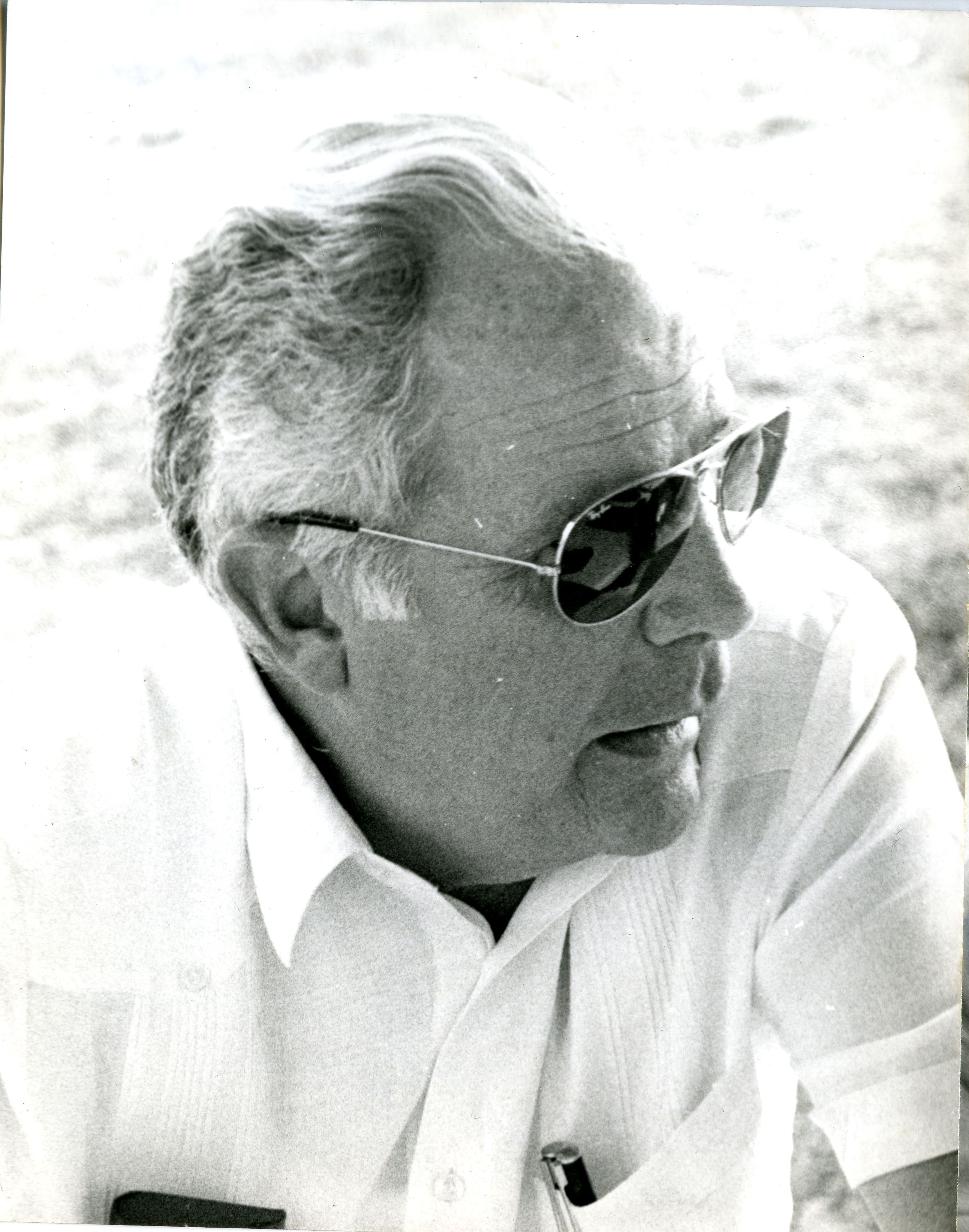En la fotografía observamos en plano lateral corto y con gafas oscuras al doctor Alfonso Holguín Beplat, ingeniero civil e interventor vallecaucano de amplia trayectoria.