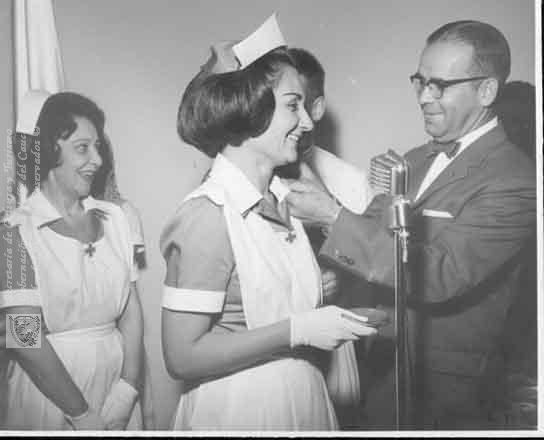 Clara Restrepo, Olga Lucía y Artemo Franco. Ceremonía de la primera promoción de las damas Grises. Cali, 1962