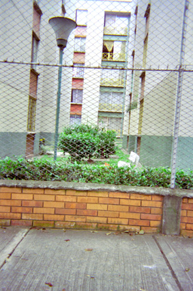 Plano Medio. Se destaca la fachada de un edificio color blanco con verde. Entre ellos un jardín con algunos arbustos y en la parte inferior un cerramiento con un muro de ladrillo y malla. En el extremo inferior una acera en concreto.