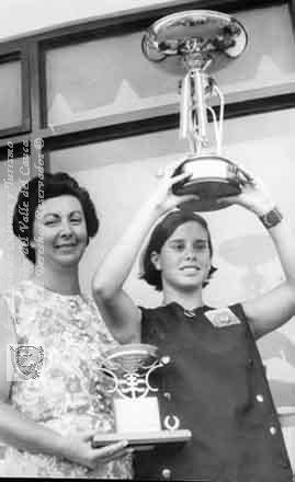 Olga Lucía de Angulo luciendo los trofeos en compañía de su señora madre. Santiago de Cali, C. 1971.