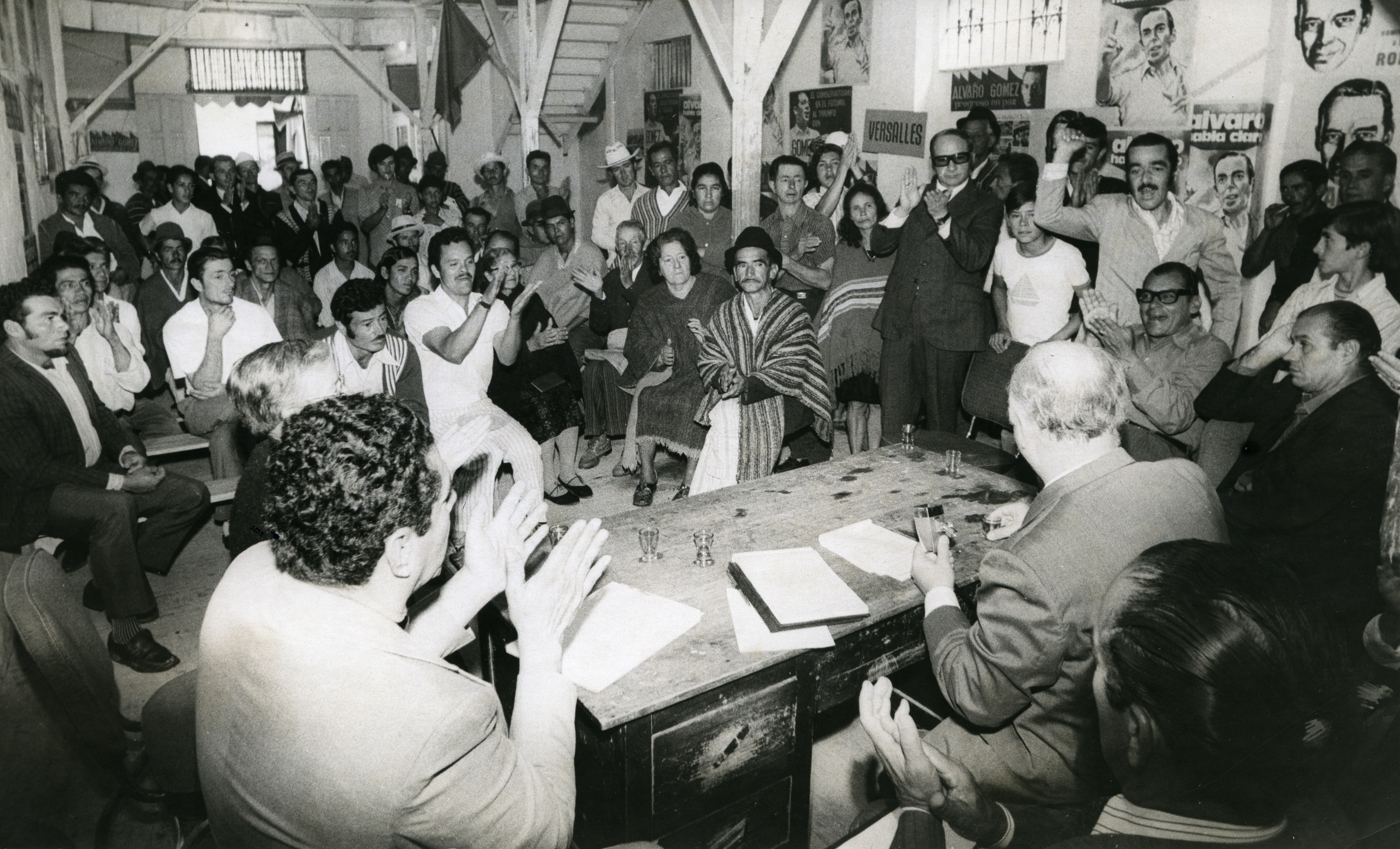 Grupo de personas reunidas, frente a ellas, algunos hombres que se dirigen sentados alrededor de una mesa. En las paredes del salón se observa publicidad política del sr Álvaro Gómez, perteneciente al partido conservador