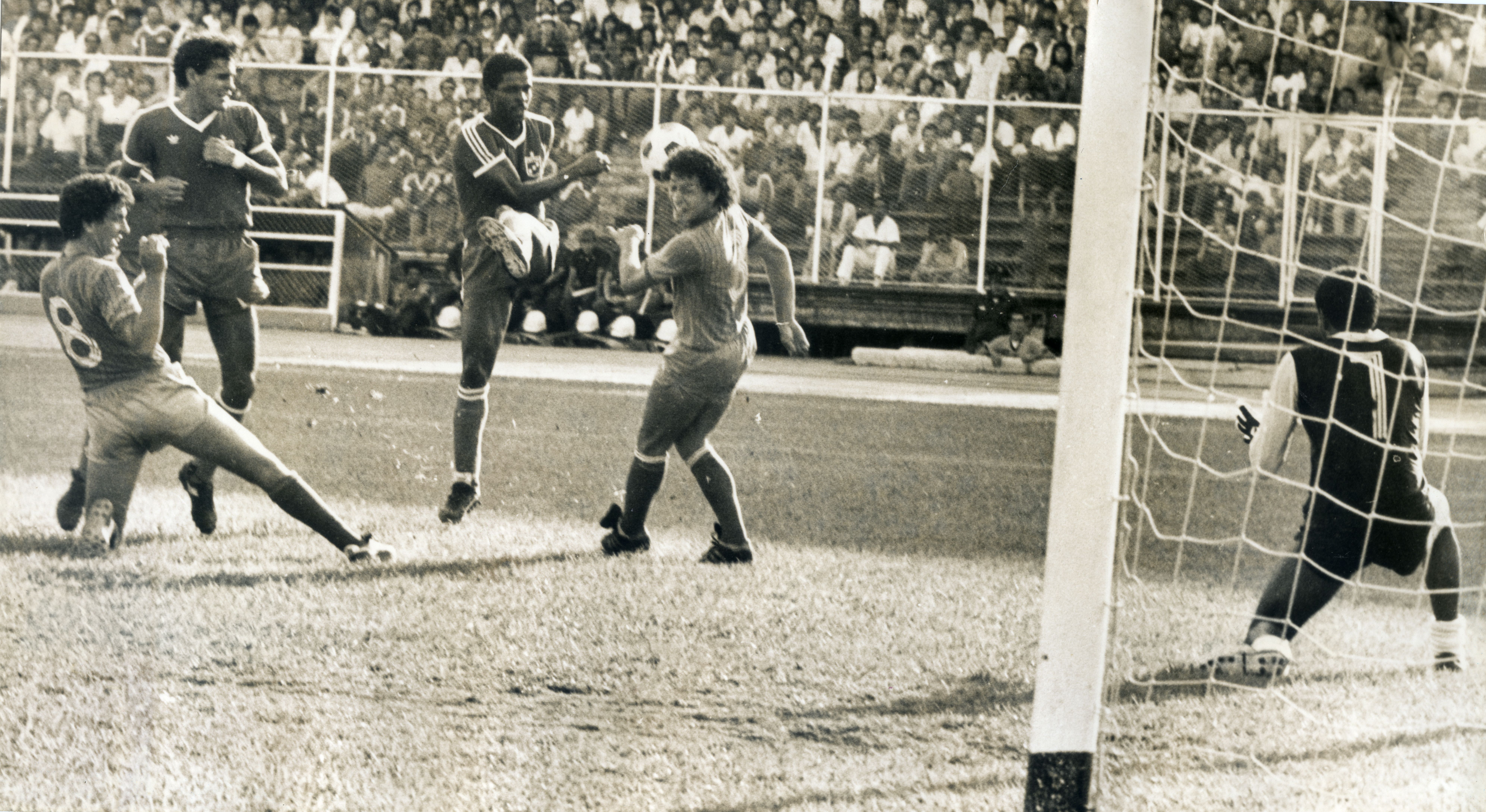 Foto de plano completo de varios jugadores, donde se ven a cuatro jugadores, dos por cada equipo en la lucha por el balon, se puede apreciar a uno de estos con el pie izquierdo estirado y el otro pie firme contra el cespec, el jugador rival se observa con la cabeza para el lado izquierdo de su humanidas, mientra el balon se ve muy pegado a su cabeza