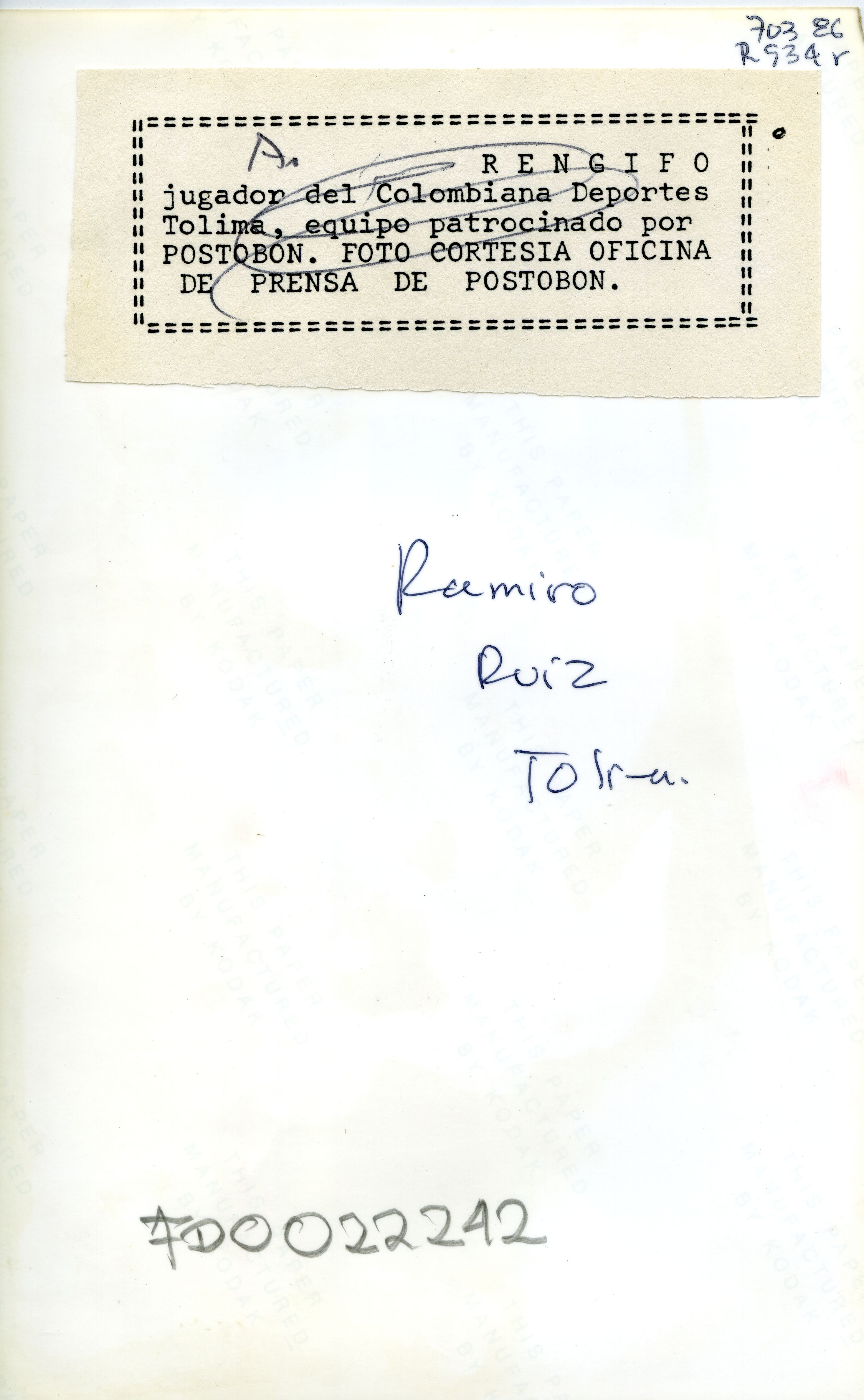 En la fotografía podemos observar al jugador de fútbol Ramiro Ruíz, jugador del equipo Deportes Tolima, equipo patrocinado por la empresa Postobón. Al reverso de la fotografía se anexa nota escrita: "Ramiro Ruíz jugador del Colombiana Deportes Tolima, equipo patrocinado por Postobón. Foto cortesia de la Oficina de Prensa de Postobón."