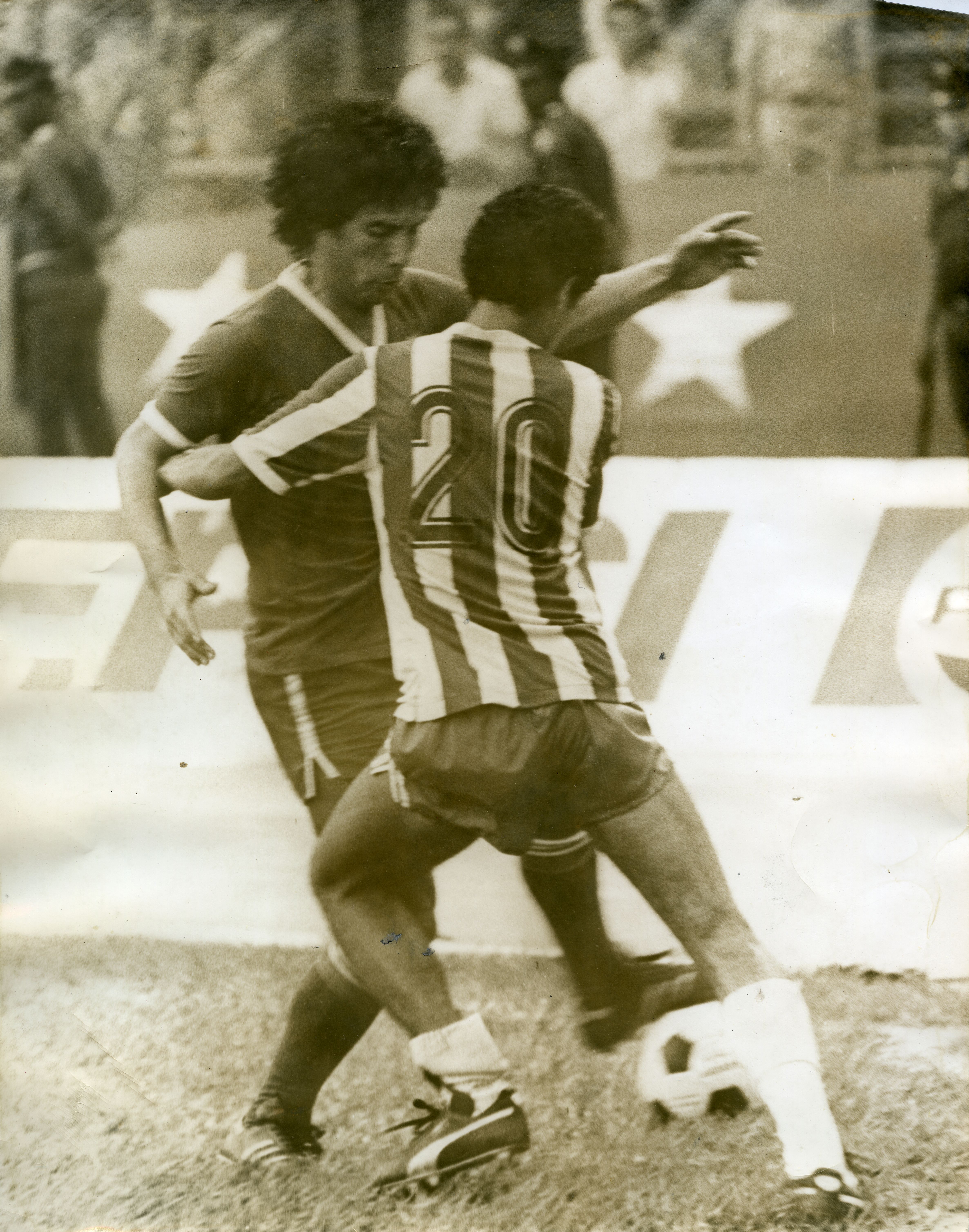 En la gráfica se observa a César Cueto, futbolista del América de Cali, luchando por el manejo de un balón con otro jugador.