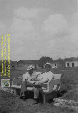 Charlando en la banca del parque de Todos los Santos, el señor Luis María Salazar y un amigo. San Pedro, 1951.
