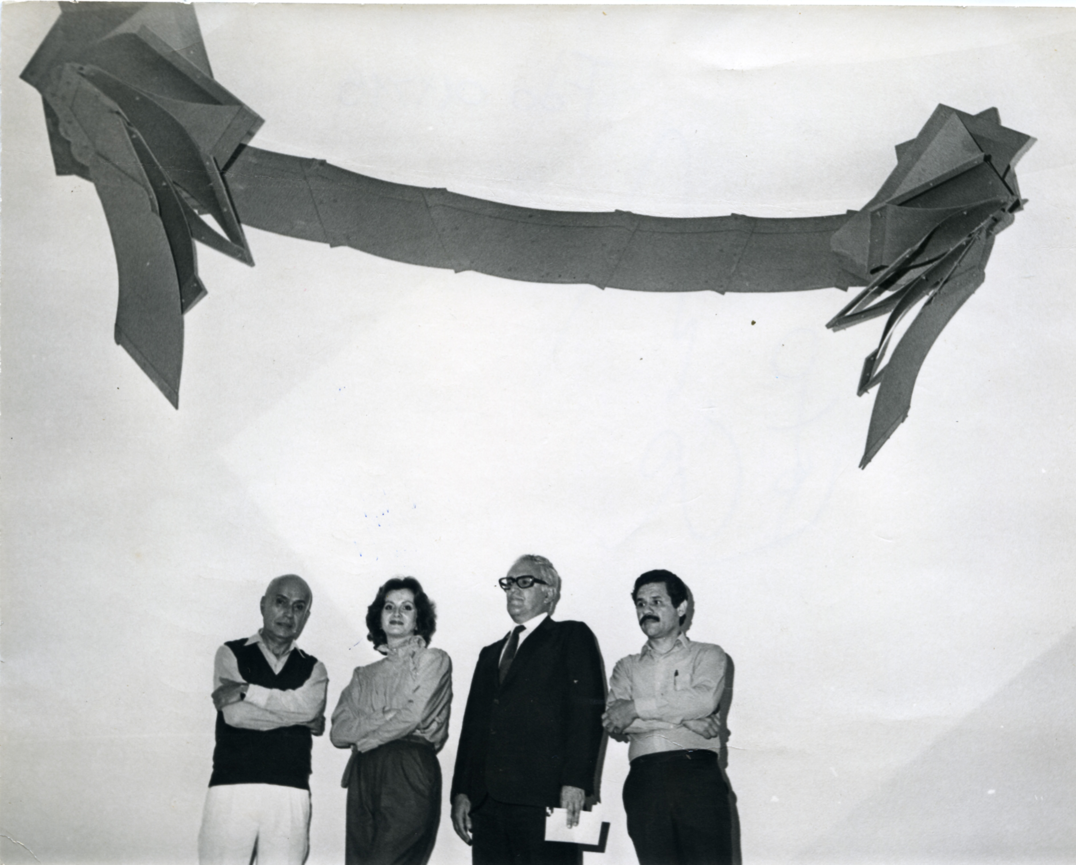 En la gráfica se observa el acto de inauguración con motivo del descubrimiento de la obra escultural "Dorada" por el maestro Edgar Negret al Instituto Departamental de Bellas Artes. Aparecen de izquierda a derecha, Edgar Negret la directora María Antonia Garcés A.