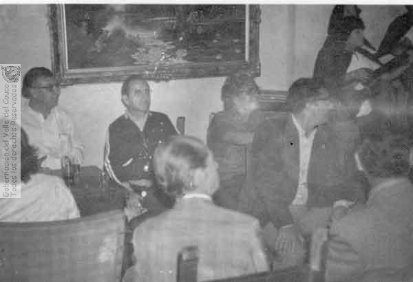 FOTO ESTUDIO (1980). Grupo de amigos: Presbítero Fabio Gabriel Villalobos, Fernando Henao Botero, Alberto Grisales, Guillermo Gómez en el Club Caicedonia & 601410. CAICEDONIA: Biblioteca Departamental Jorge Garces Borrero.
