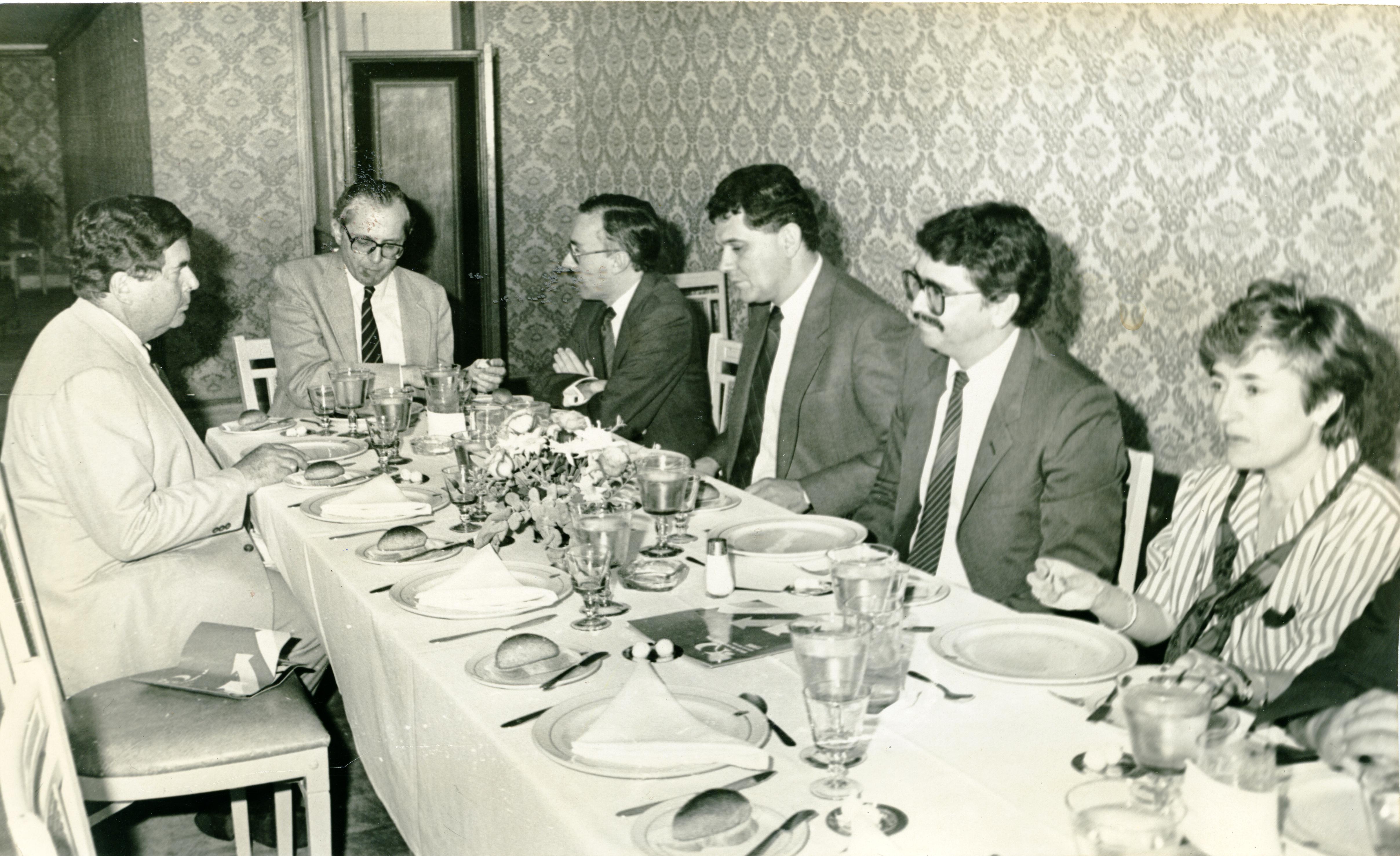 Reverso: En el almuerzo ofrecido a los asistentes a la Asamblea de la Bolsa de Occidente, aparecen en la gráfica los señores Gustavo Gómez Franco, presidente de Cartóm de Colombia; Jorge Ernesto Holguín Beplat, presidente del Comité Empresarial del Valle del Cauca; doctor Jose Ricardo Caicedo, presidente de la junta directiva de la Bolsa de Occidente; doctor Javier Roldán Barbosa, de Infivalle y Alba Lucía Orozco de Triana, presidente de la Comisión Nacional de Valores.