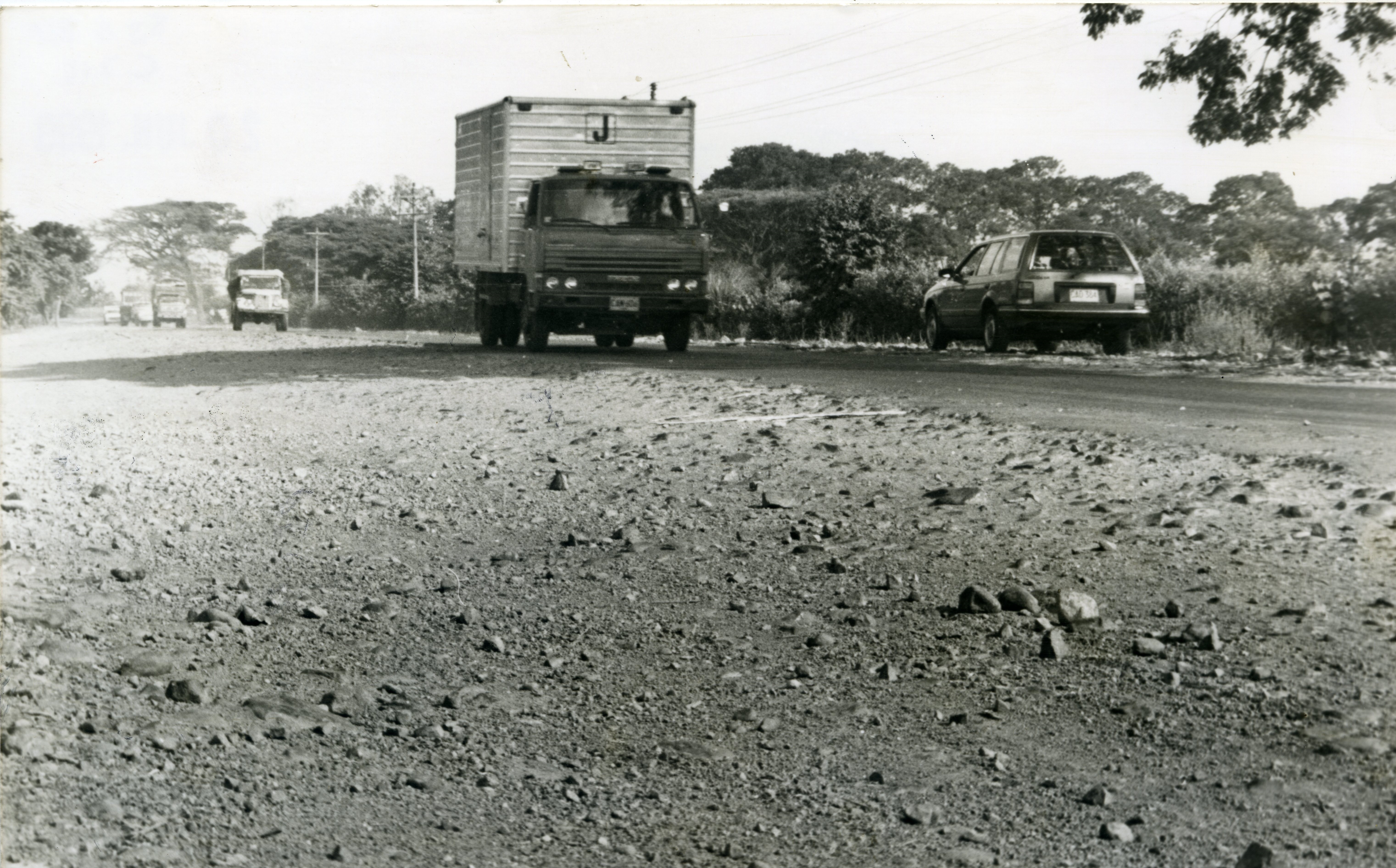 Al reverso de la fotografía se anexa recorte de prensa: "En este tramo la carpeta de cemento ya no existe, un extenso bache es paso obligado. La carretera Cali-Candelaria-Florida se continúa deteriorando a ppaso rápido sin que, hasta el momento, se sepa cuándo cambiará el panorama."