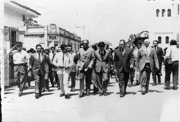 Caminata por la plaza principal en una visita del Gobernador del valle del Cauca Marino Rengifo a Riofrío. 1972.