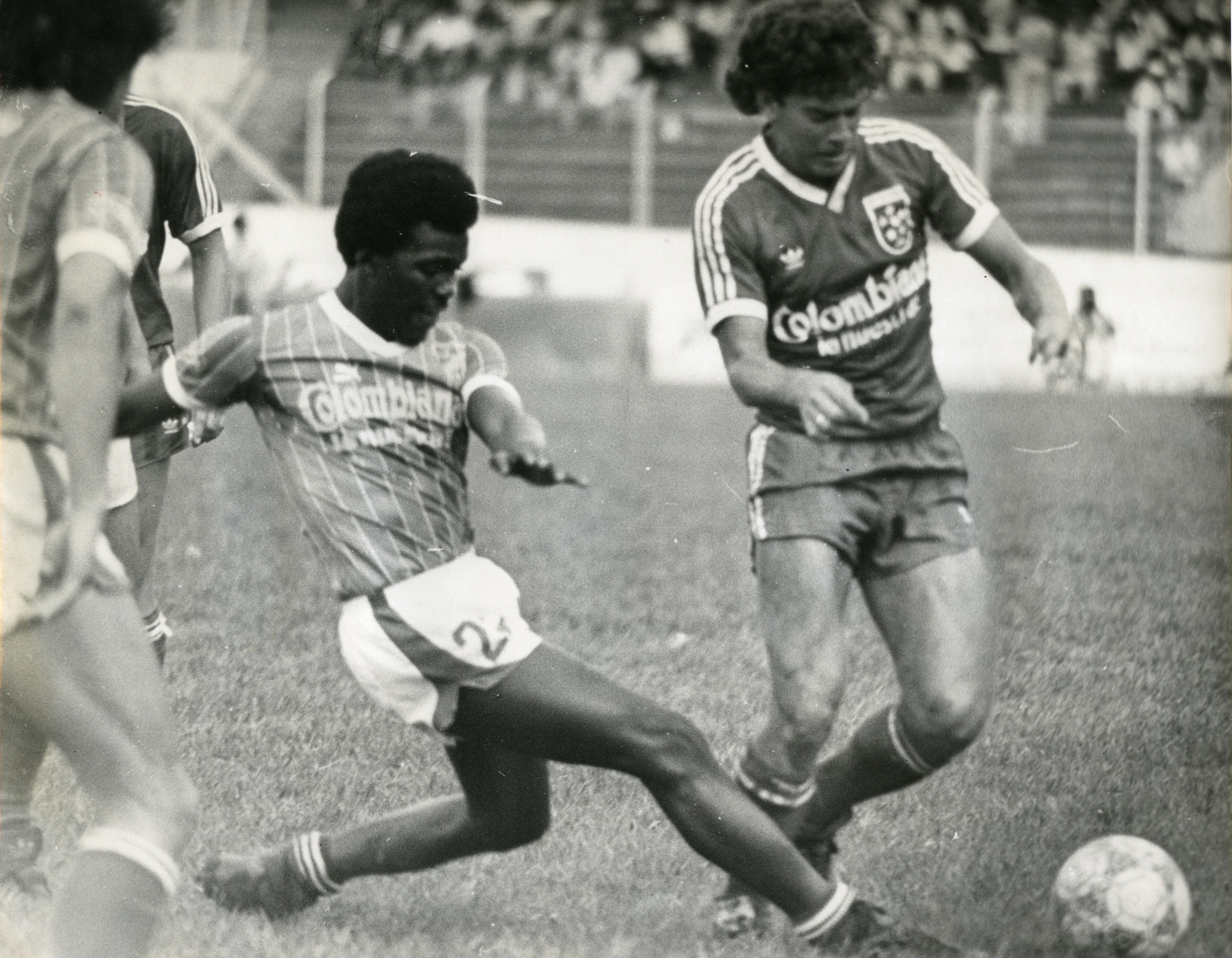 Partido de Fútbol realizado en el estadio Pascual Guerrero entre América de Cali y Millonarios. En la gráfica se aprecia disputa del balón jugador Herrera en el campo de juego. Observamos público en la tribuna
