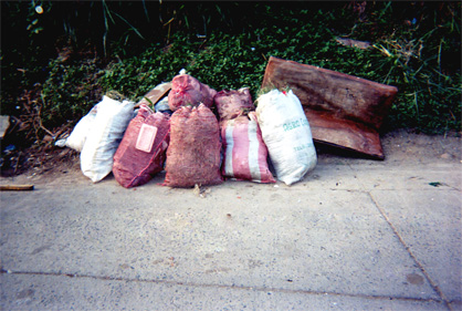 En una calle se observan costales con basura. Al fondo maleza. Plano medio.