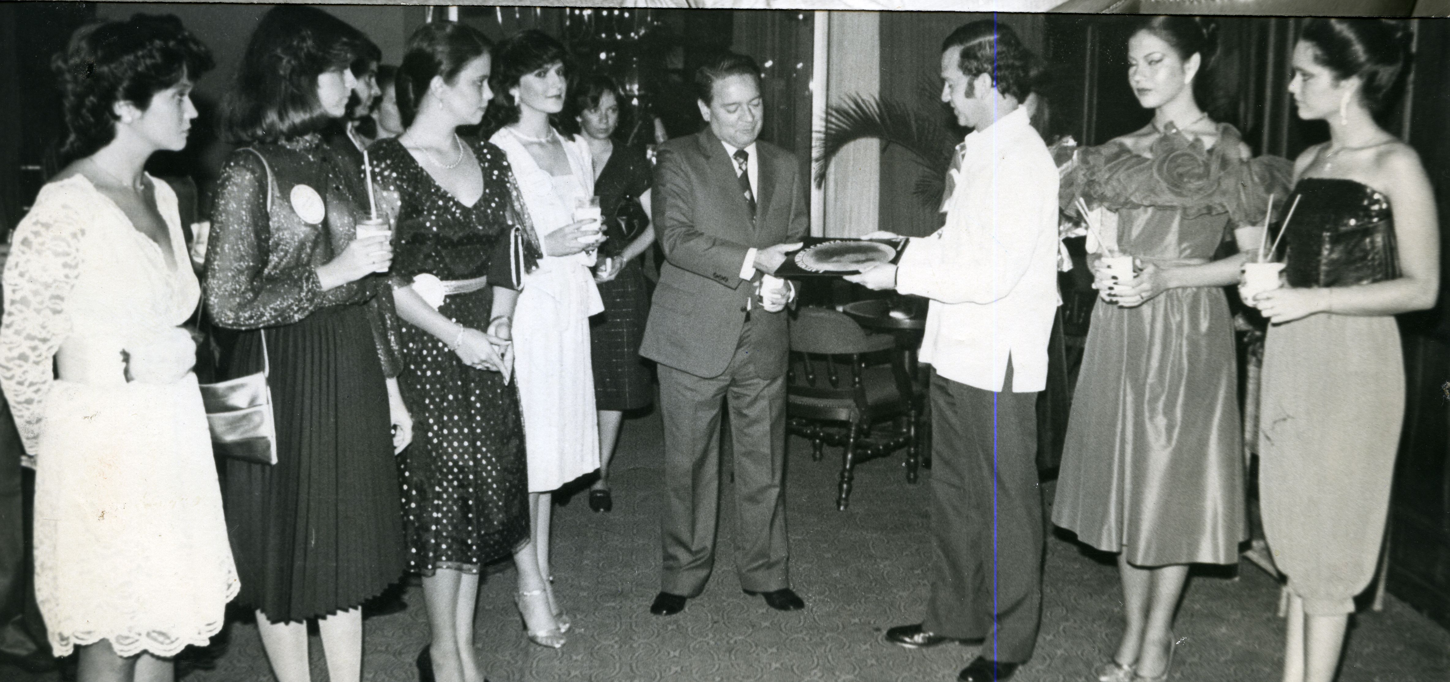 Fotografía de plano completo de Humberto González Narváez, donde se ve de pie recibiendo de manos de un hombre detalle, junto a él se ven dos mujeres elegantes y al lado de la otra persona lo acompañan cinco mujeres más
