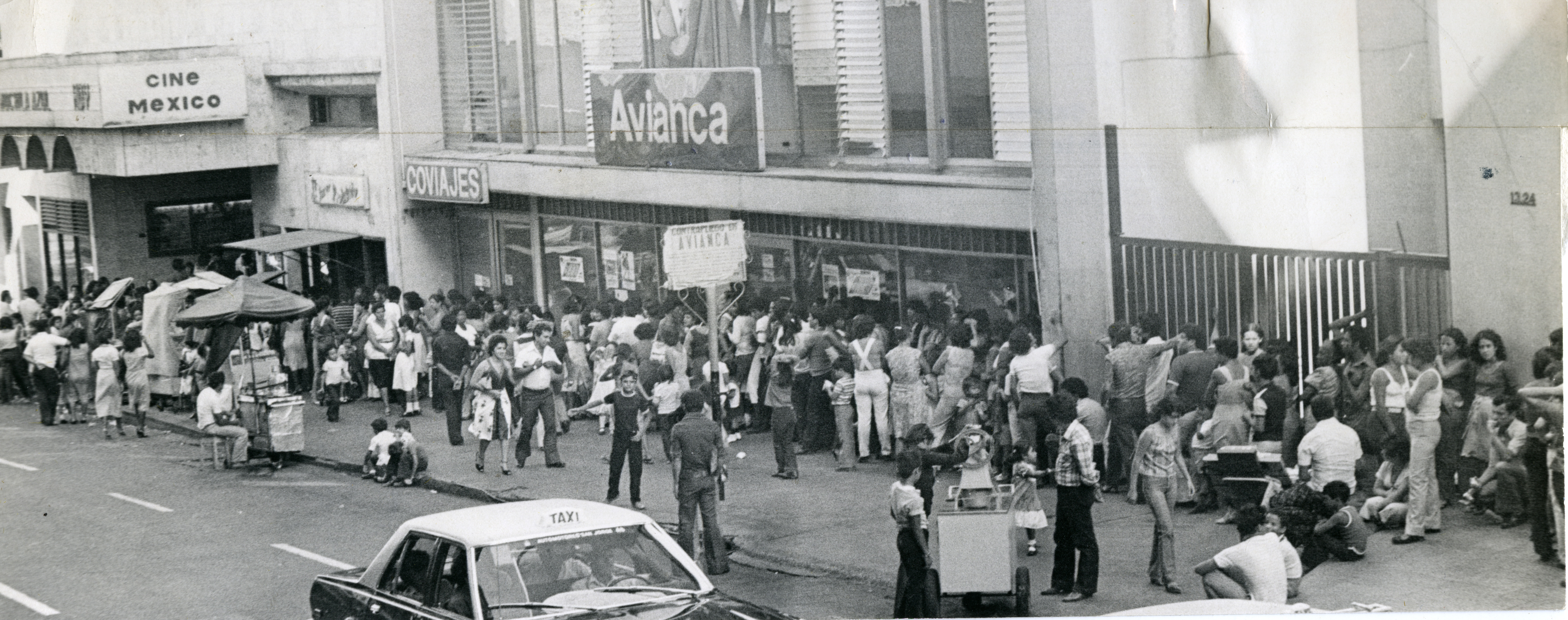 Fila del público para ingresar por la carrera 4a entre calles 15 y 14, al Teatro Cervantes. En el anuncio del teatro se estaba mostrando la película "La Mochila Azul".