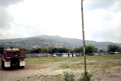 Imagen tomada en lote baldío. Se observa el barrio Siloé en zona de ladera. Cielo nublado. En primer plano un poste divide la imagen. Al lado izquierdo una volqueta parqueada. Plano general.