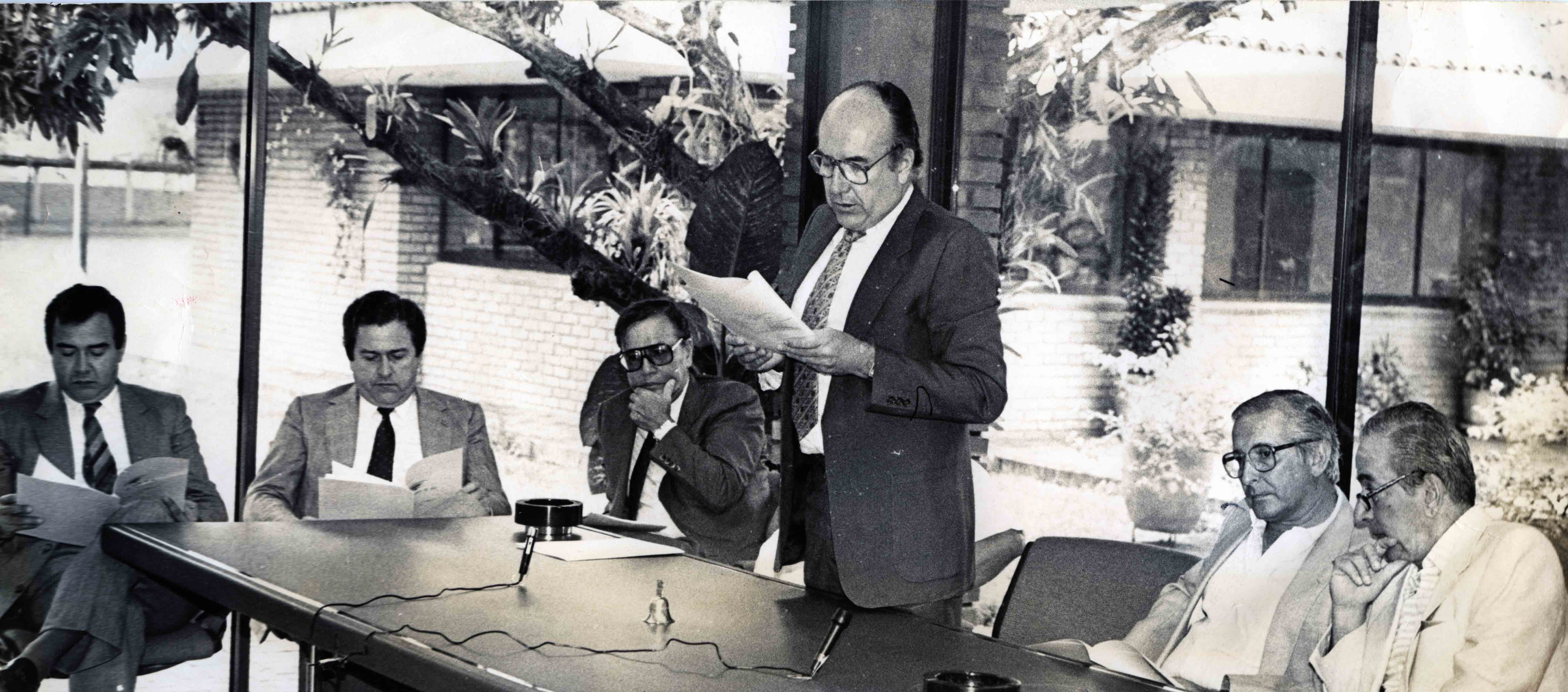 Asamblea de Socios de la Plaza de Toros de Cañaveralejo en Santiago de Cali. En la fotografía se distingue a Álvaro Fernando Quintero, Vicente Borrero Restrepo, Jorge Herrera Barona, Álvaro Correa Holguín >El Archivo del Patrimonio Fotográfico y Fílmico del Valle del Cauca es responsabilidad de la Biblioteca Departamental del Valle Jorge Garcés Borrero, por convenio de cooperación suscrito con la Secretaria del Cultura Departamental, con el fin de aunar esfuerzos para su conservación, preservación y divulgación del Archivo entre la comunidad Vallecaucana, especialmente entre los estudiantes e investigadores que visitan la Biblioteca, propiciando el su uso y consulta permanente. La universidad Icesi es un colaborador en el proceso de difusión, facilitando la tecnología que permite la consulta de las imágenes.